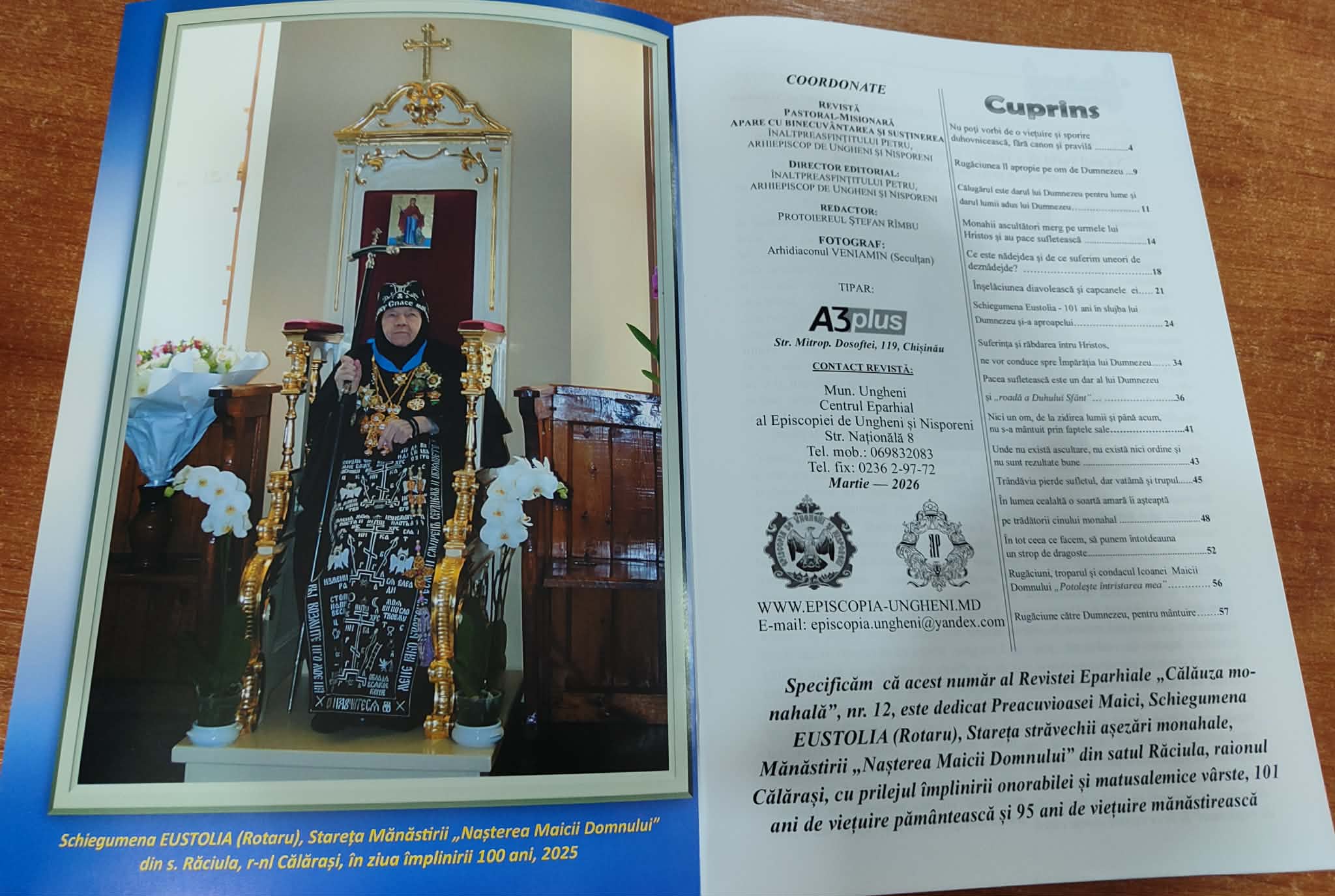 Acest al 12-lea număr apărut deja, este dedicat, Schiegumenii EUSTOLIA (Rotaru), stareța Mănăstirii „Nașterea Domnului” din s. Răciula, rn Călărași, cu prilejul împlinirii 101 ani de viețuire pământească și 95 ani de viețuire mănăstirească.