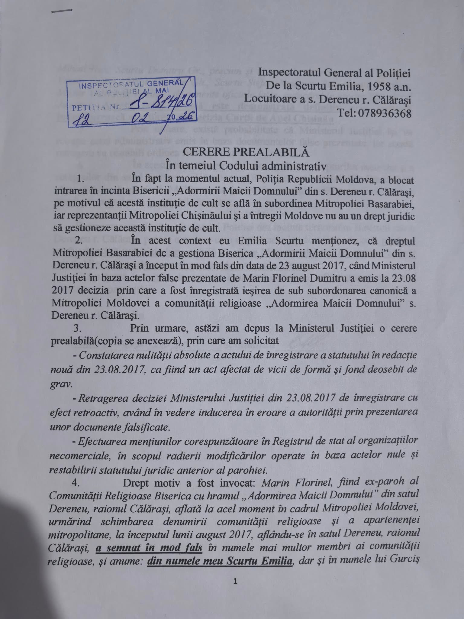 Joi, 12 februarie, 2026, prot. Vadim COROSTINSCHI, Secretarul Episcopiei de Ungheni și Nisporeni, cu binecuvântarea Chiriarhului, Înaltpreasfințitul Arhiepiscop PETRU și în numele creștinilor parohiei „Adormirea Maicii Domnului” din s. Dereneu, rn. Călărași, a depus cererea prealabila la IGP (Inspectoratul General de Poliție) Chișinău, pentru a fi luat cordonul de polițiști din fața bisericii din localitatea menționată.