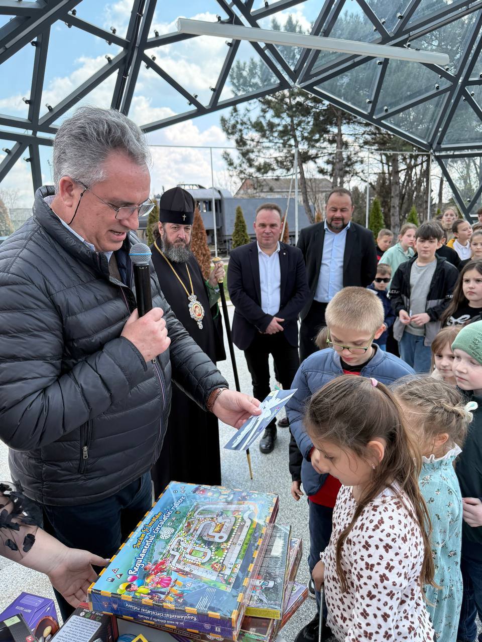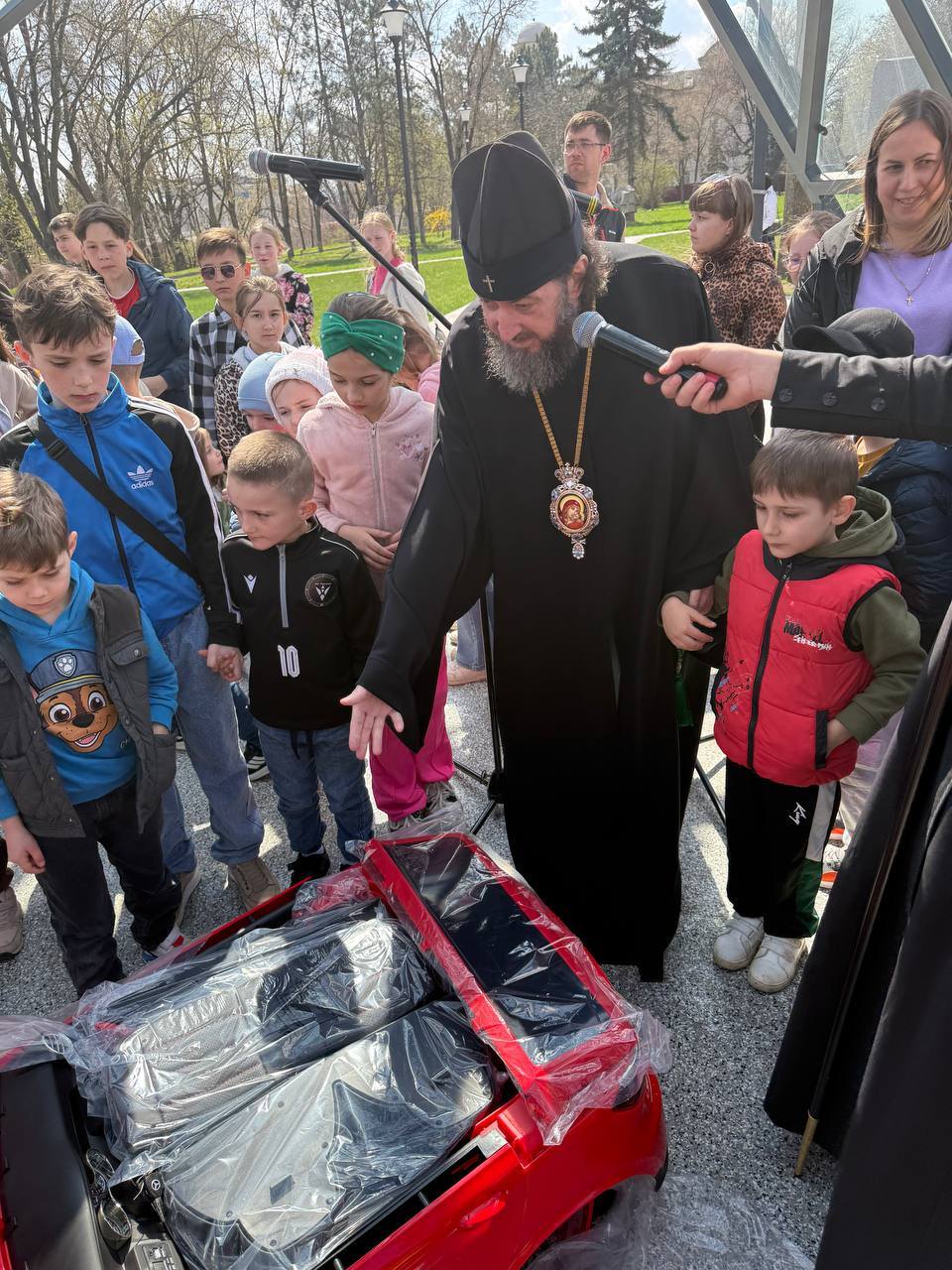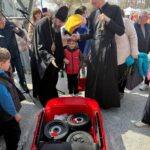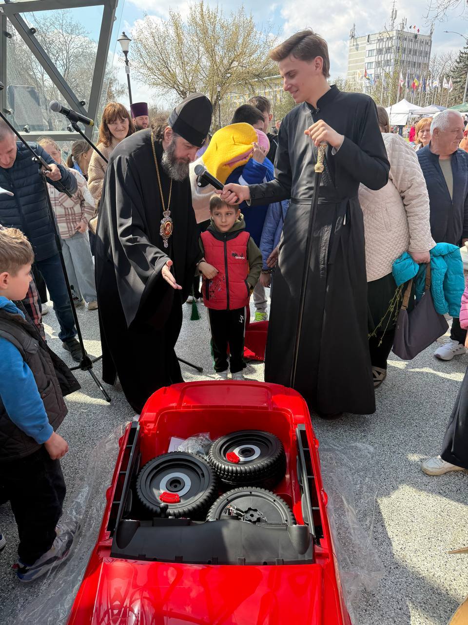 Surpriza cea mare a fost oferirea de către Înaltpreasfințitul Arhiepiscop PETRU a unei mașini electrică pentru copii, care a primit-o un băiețel pe nume Matei.