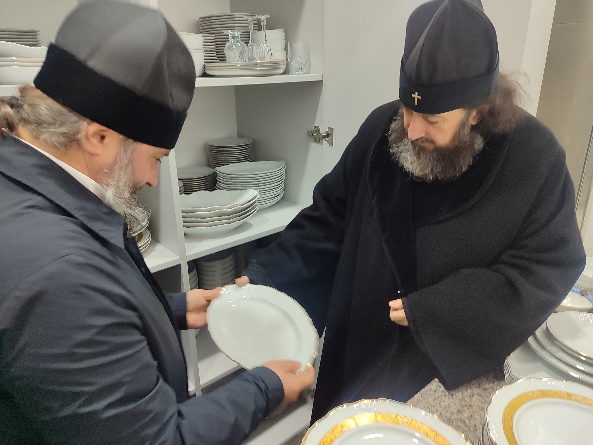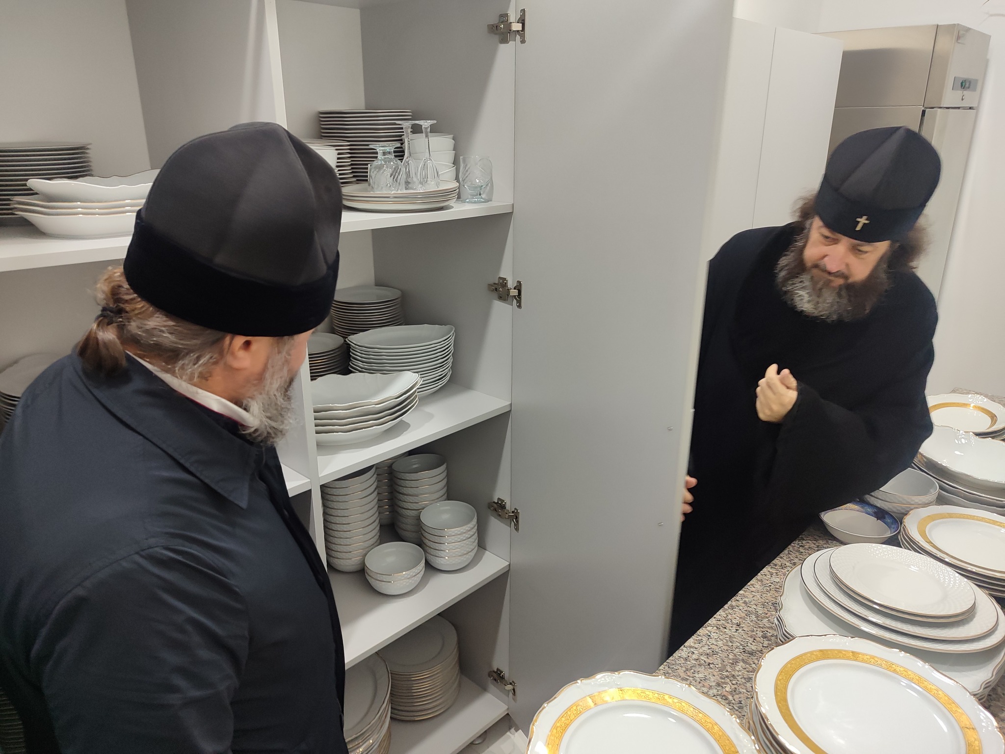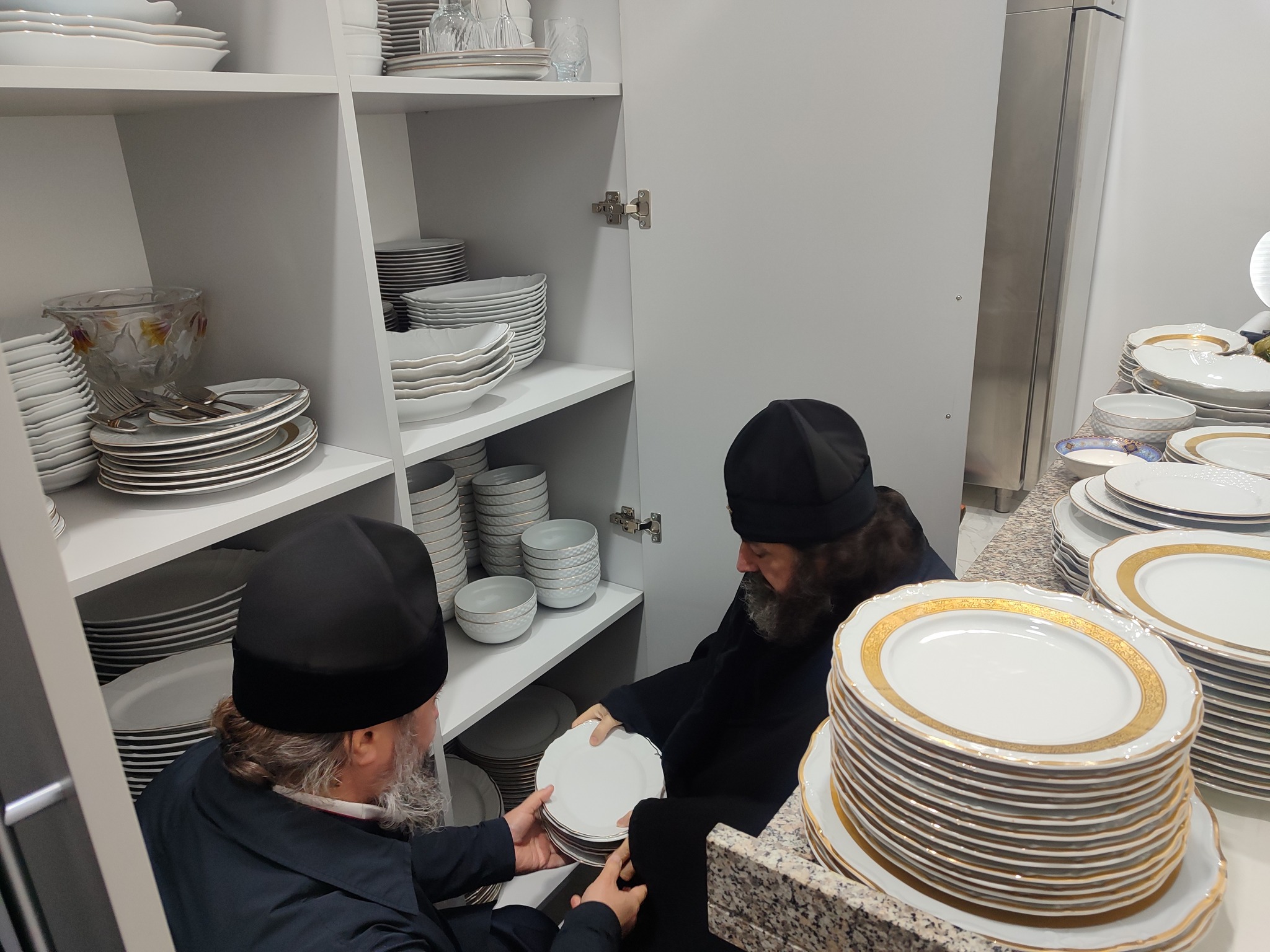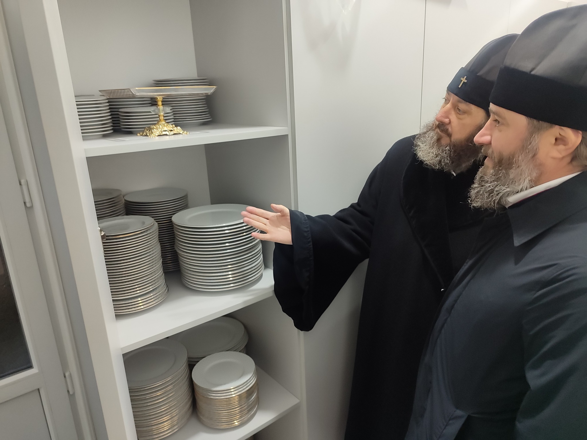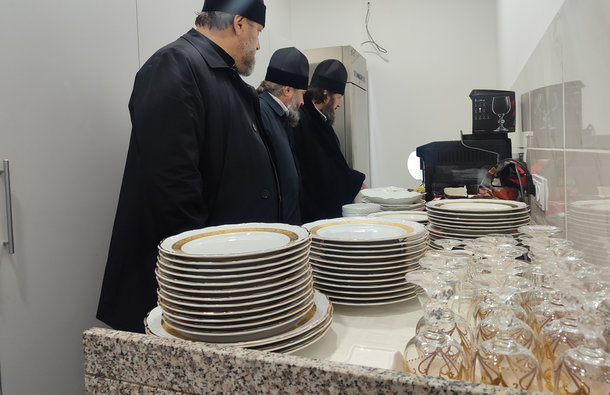 Apoi, Înaltpreasfințitul Arhiepiscop PETRU însoțit de acești preacuvioși părinți, s-a deplasat la Catedrala Episcopală din mun. Ungheni, unde a prezentat incinta trapezei ,,Sf. Ierarh Ioan cel Milostiv”, arătând tot ce a fost făcută aici și obiectele (mesele, scaunele, condiționerele, lustrele, frigiderele, utilajul pentru facerea aluatului, dulapurile, aragazurile, mesele de inox, cuptoarele cu microunde, toată vesela care este în număr de peste o mie bucăți – farfurii, căni, pahare, cuțite, linguri, furculițe, veze) pe care Vladâca PETRU prin strădanie și cu multă cheltuială le-a procurat, amenajând corespunzător această frumoasă trapeză.
