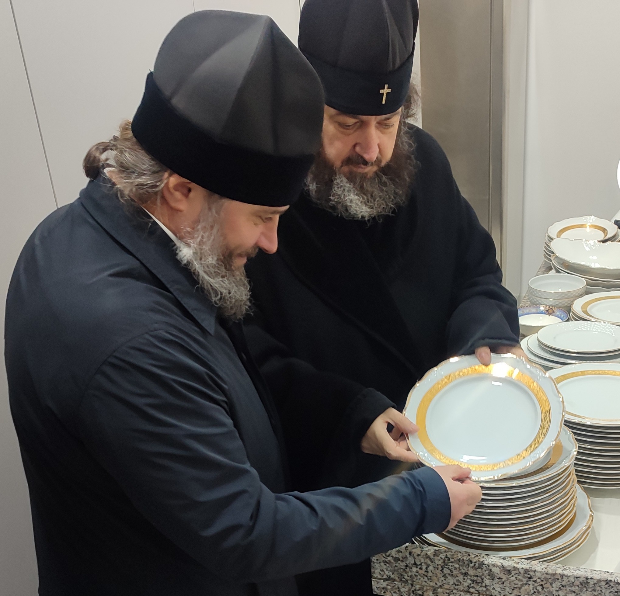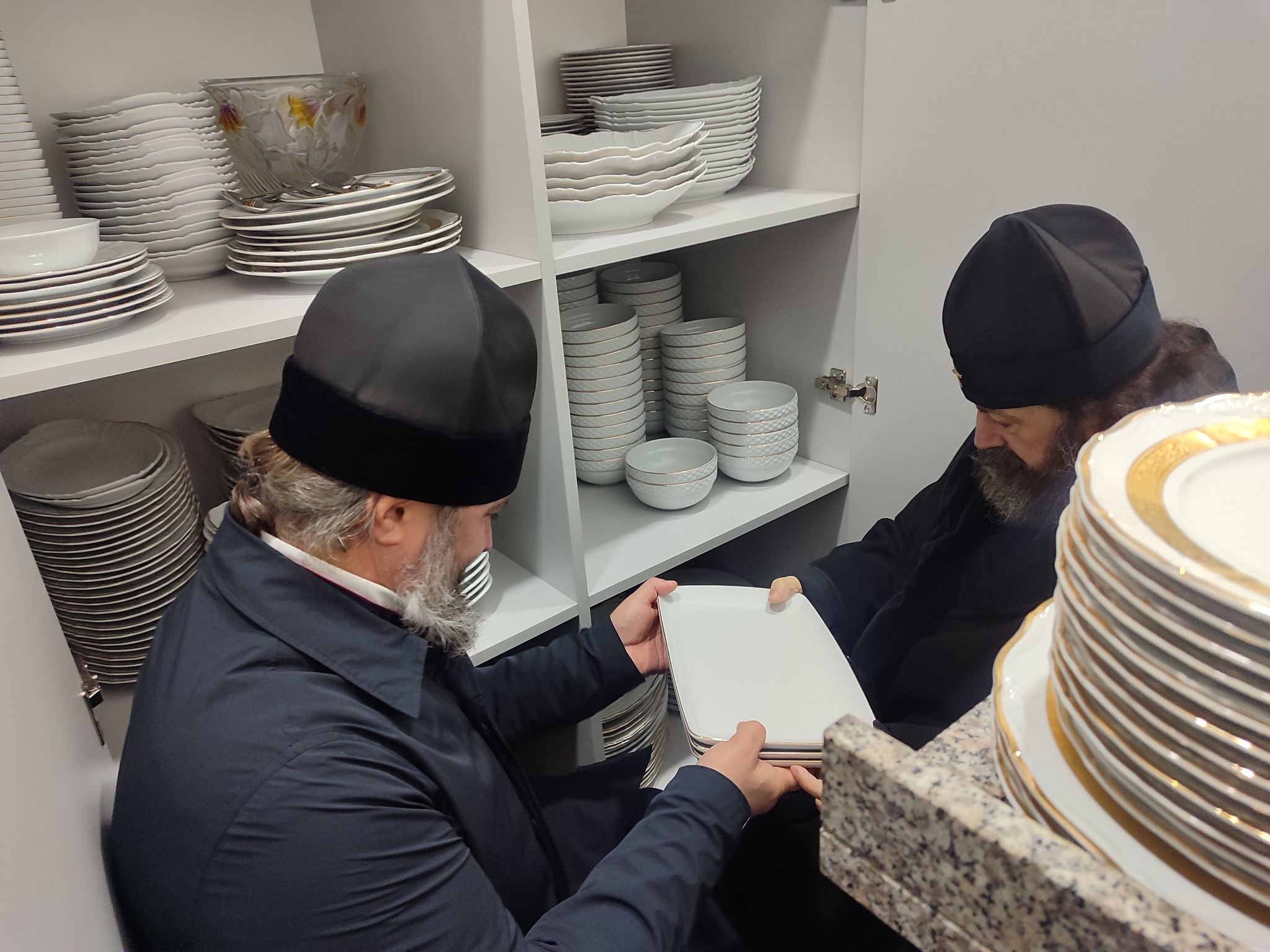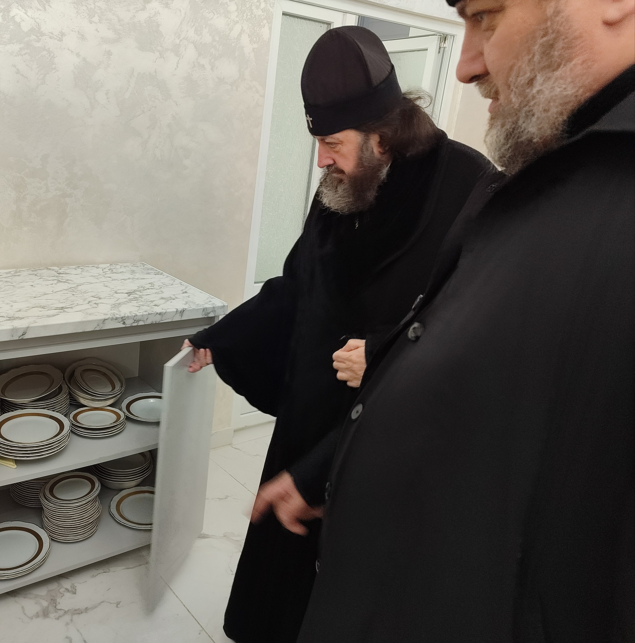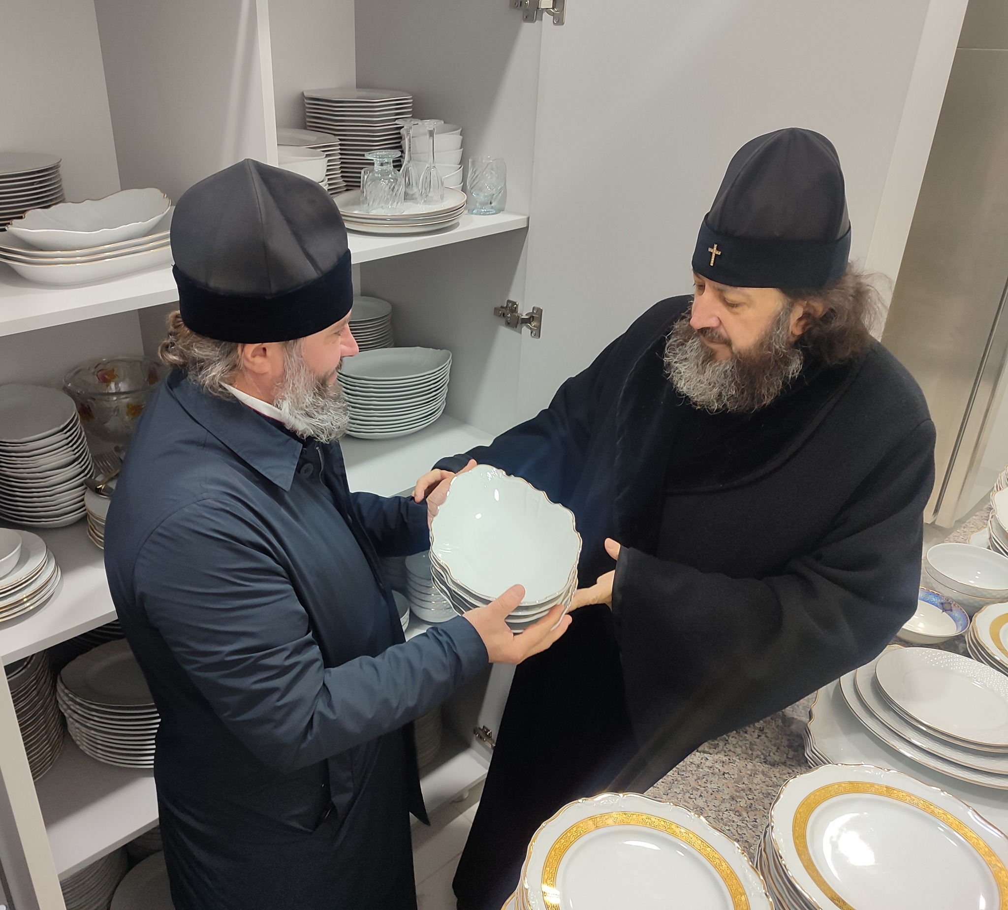 Apoi, Înaltpreasfințitul Arhiepiscop PETRU însoțit de acești preacuvioși părinți, s-a deplasat la Catedrala Episcopală din mun. Ungheni, unde a prezentat incinta trapezei ,,Sf. Ierarh Ioan cel Milostiv”, arătând tot ce a fost făcută aici și obiectele (mesele, scaunele, condiționerele, lustrele, frigiderele, utilajul pentru facerea aluatului, dulapurile, aragazurile, mesele de inox, cuptoarele cu microunde, toată vesela care este în număr de peste o mie bucăți – farfurii, căni, pahare, cuțite, linguri, furculițe, veze) pe care Vladâca PETRU prin strădanie și cu multă cheltuială le-a procurat, amenajând corespunzător această frumoasă trapeză.