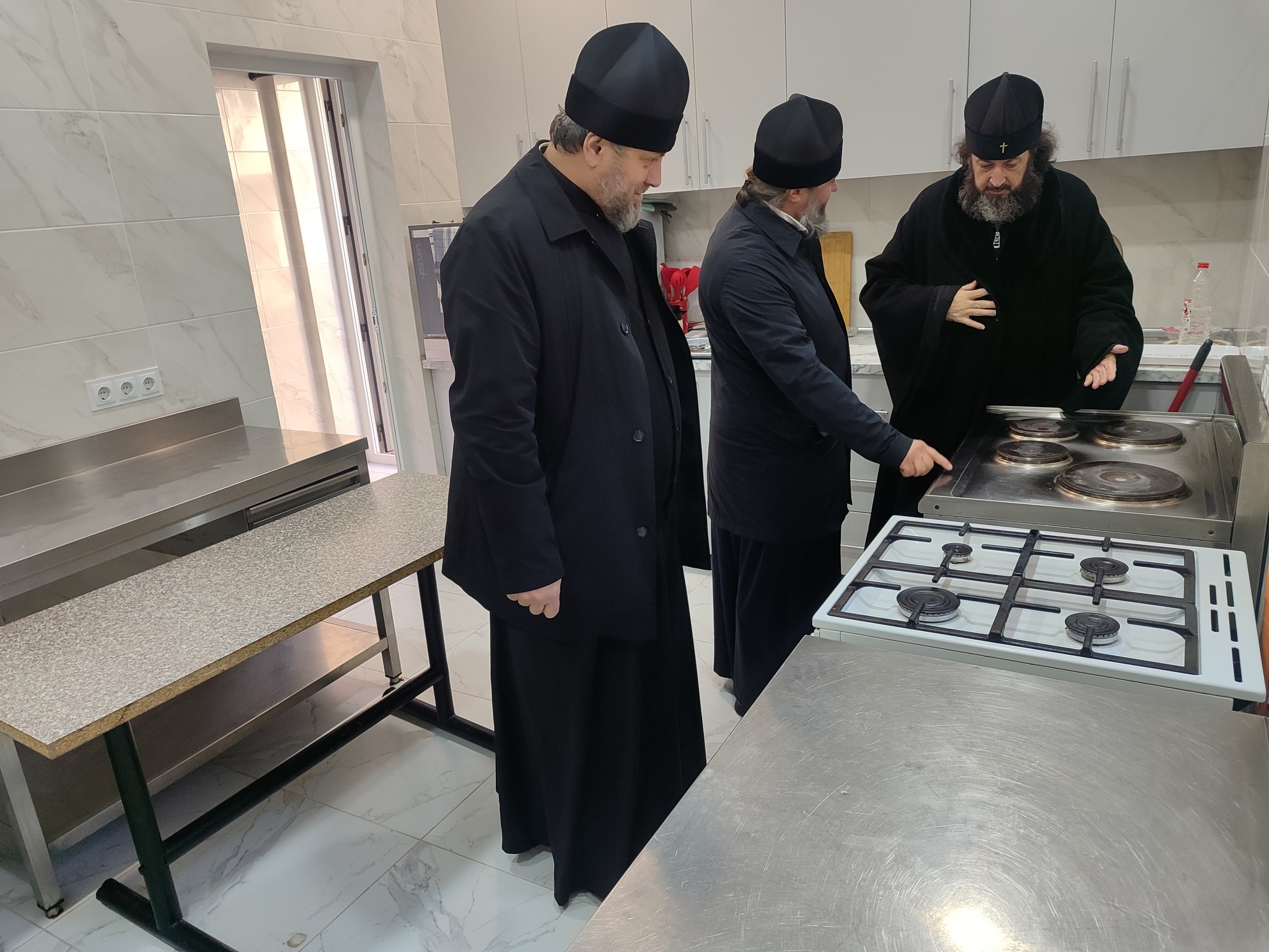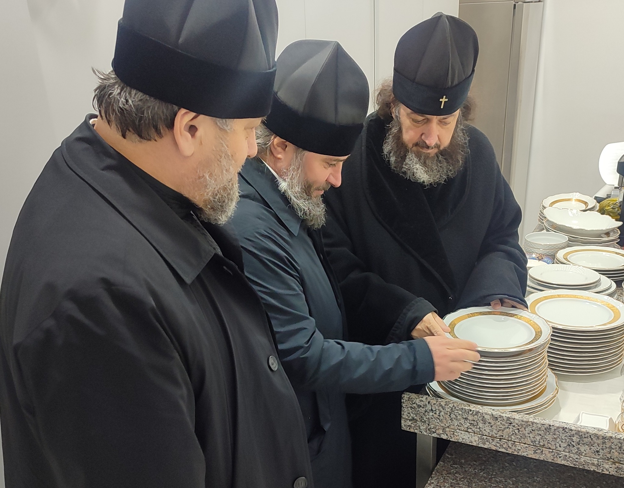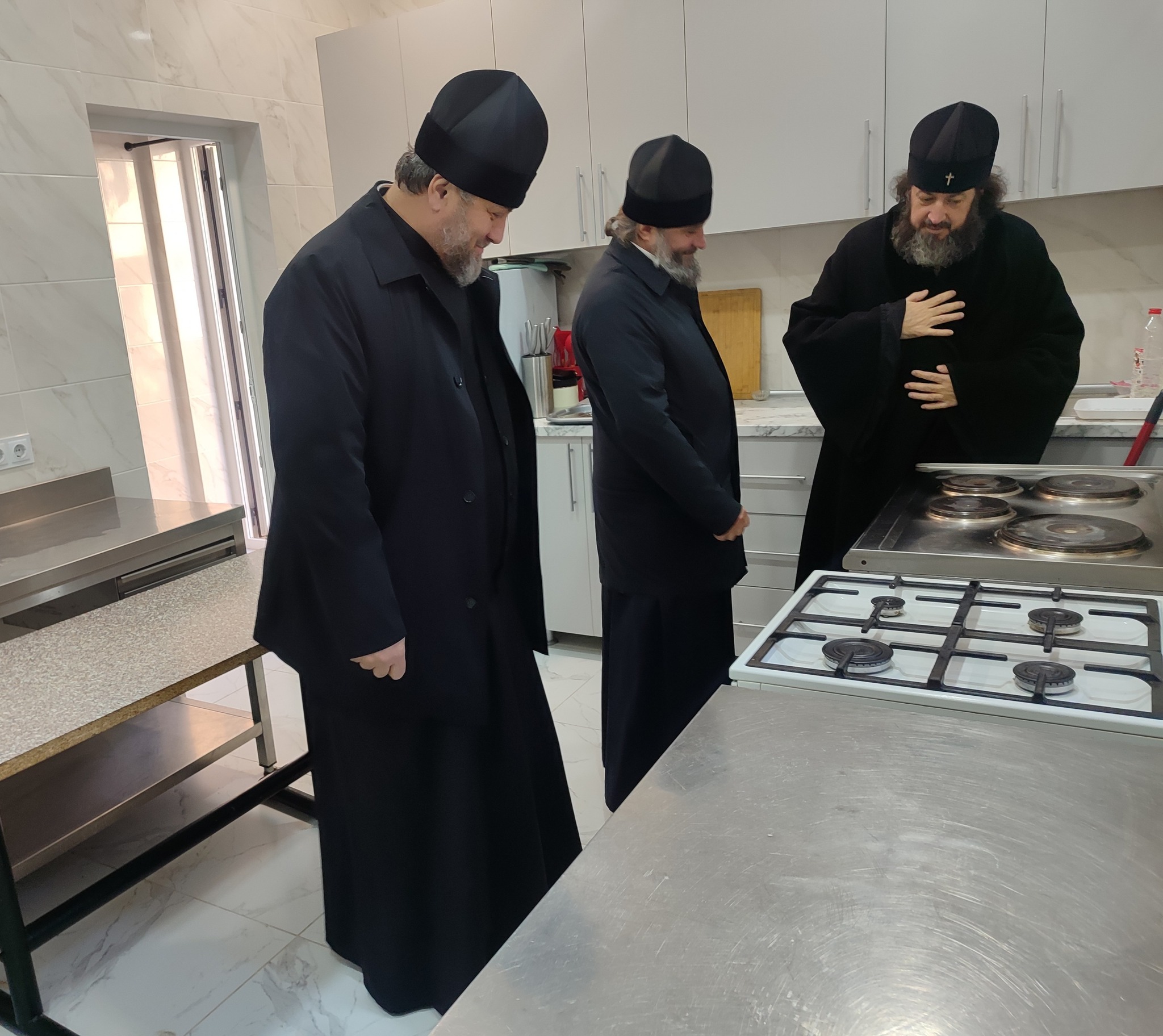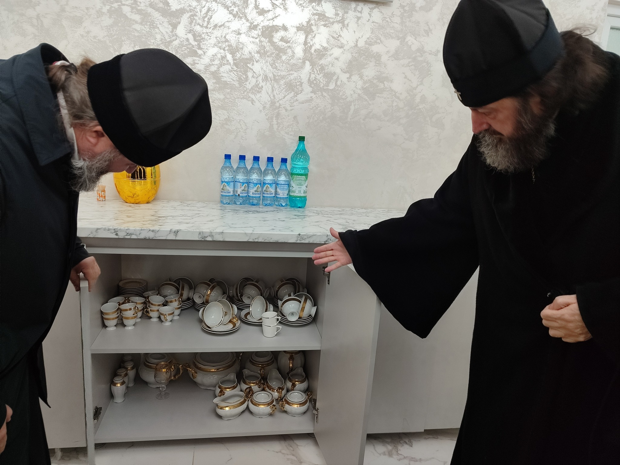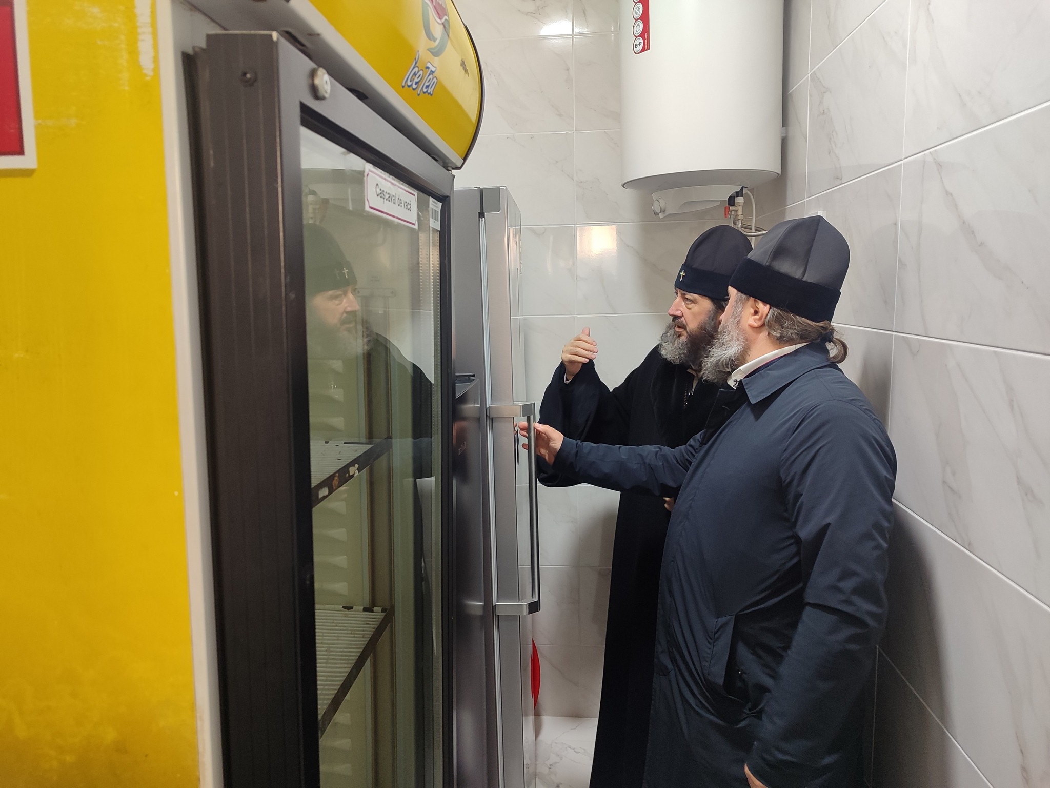 Apoi, Înaltpreasfințitul Arhiepiscop PETRU însoțit de acești preacuvioși părinți, s-a deplasat la Catedrala Episcopală din mun. Ungheni, unde a prezentat incinta trapezei ,,Sf. Ierarh Ioan cel Milostiv”, arătând tot ce a fost făcută aici și obiectele (mesele, scaunele, condiționerele, lustrele, frigiderele, utilajul pentru facerea aluatului, dulapurile, aragazurile, mesele de inox, cuptoarele cu microunde, toată vesela care este în număr de peste o mie bucăți – farfurii, căni, pahare, cuțite, linguri, furculițe, veze) pe care Vladâca PETRU prin strădanie și cu multă cheltuială le-a procurat, amenajând corespunzător această frumoasă trapeză.