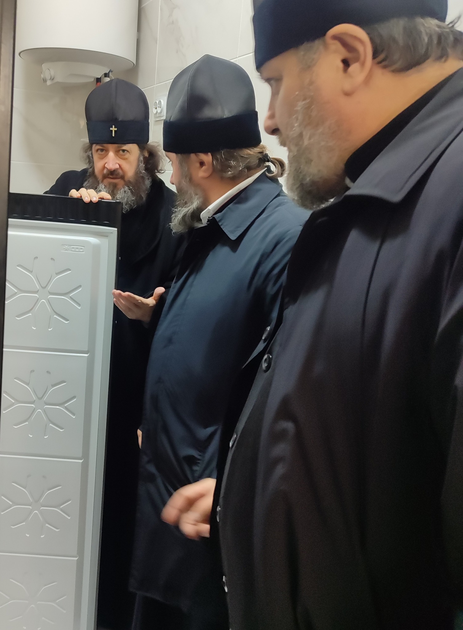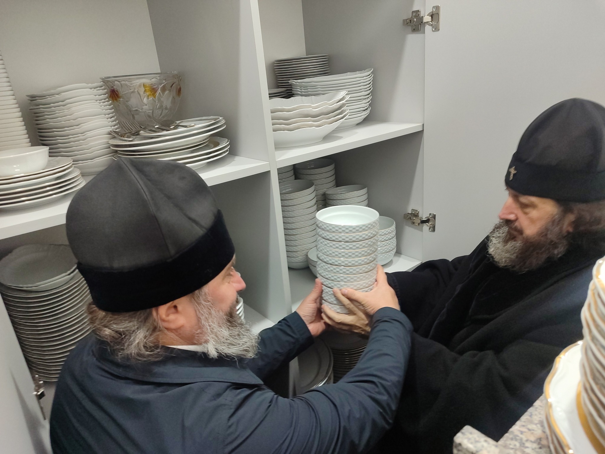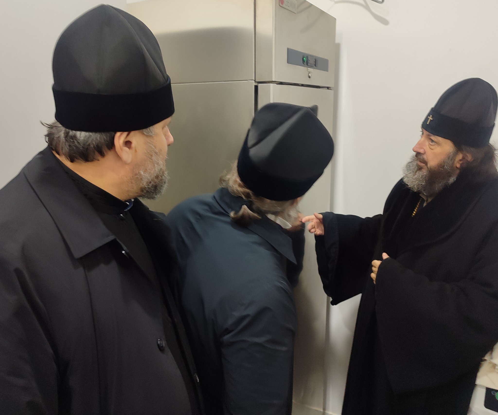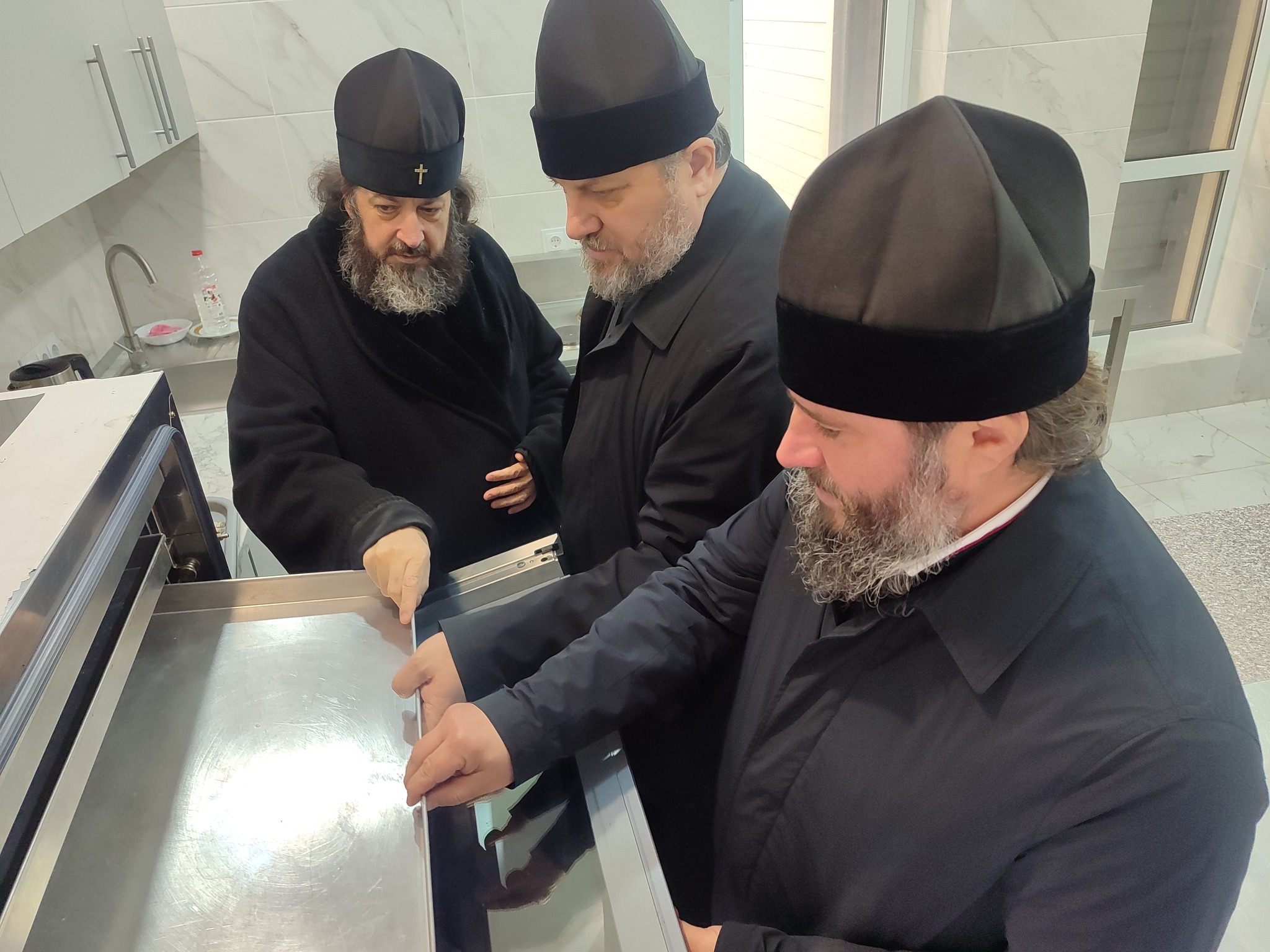 Apoi, Înaltpreasfințitul Arhiepiscop PETRU însoțit de acești preacuvioși părinți, s-a deplasat la Catedrala Episcopală din mun. Ungheni, unde a prezentat incinta trapezei ,,Sf. Ierarh Ioan cel Milostiv”, arătând tot ce a fost făcută aici și obiectele (mesele, scaunele, condiționerele, lustrele, frigiderele, utilajul pentru facerea aluatului, dulapurile, aragazurile, mesele de inox, cuptoarele cu microunde, toată vesela care este în număr de peste o mie bucăți – farfurii, căni, pahare, cuțite, linguri, furculițe, veze) pe care Vladâca PETRU prin strădanie și cu multă cheltuială le-a procurat, amenajând corespunzător această frumoasă trapeză.