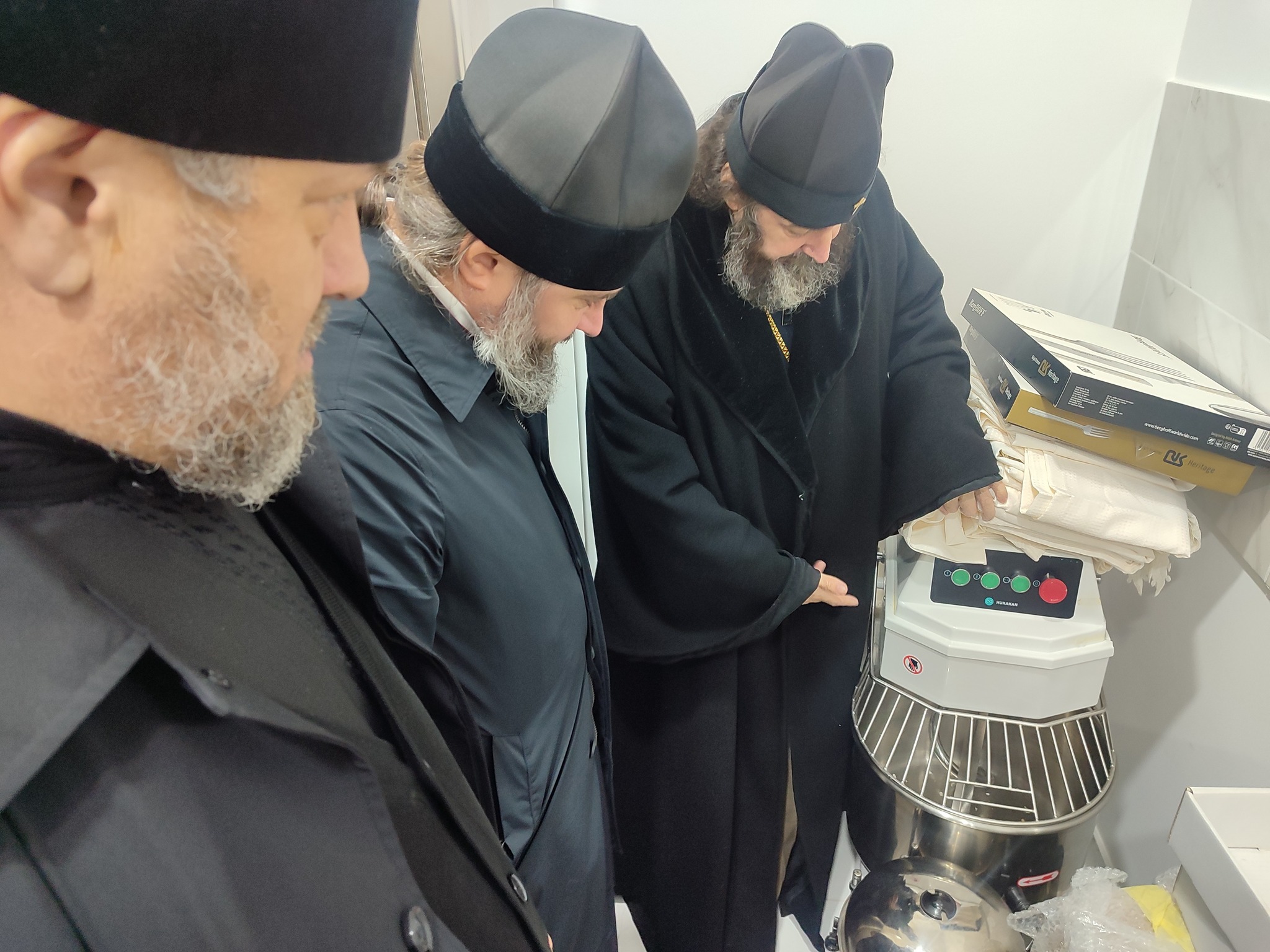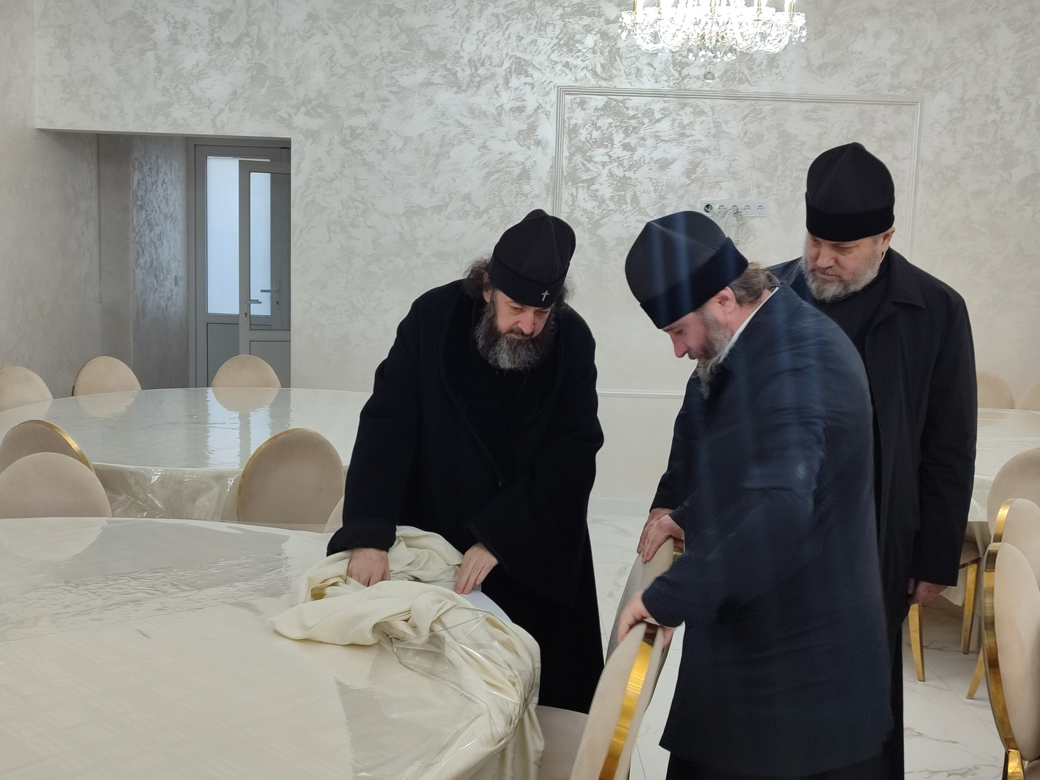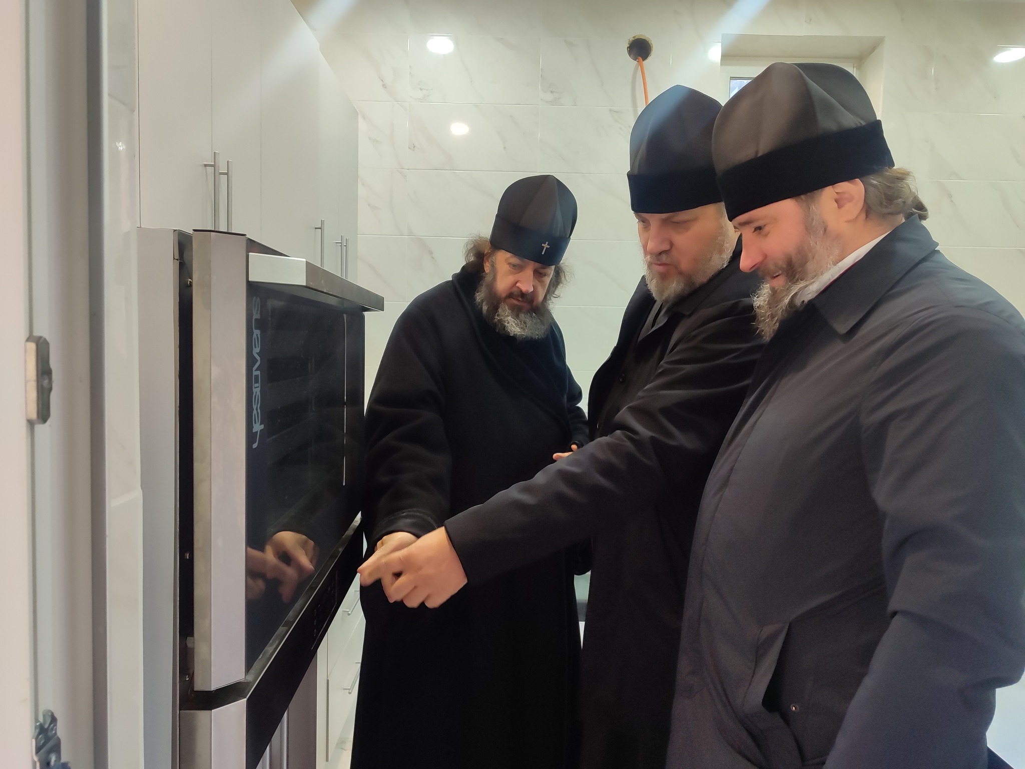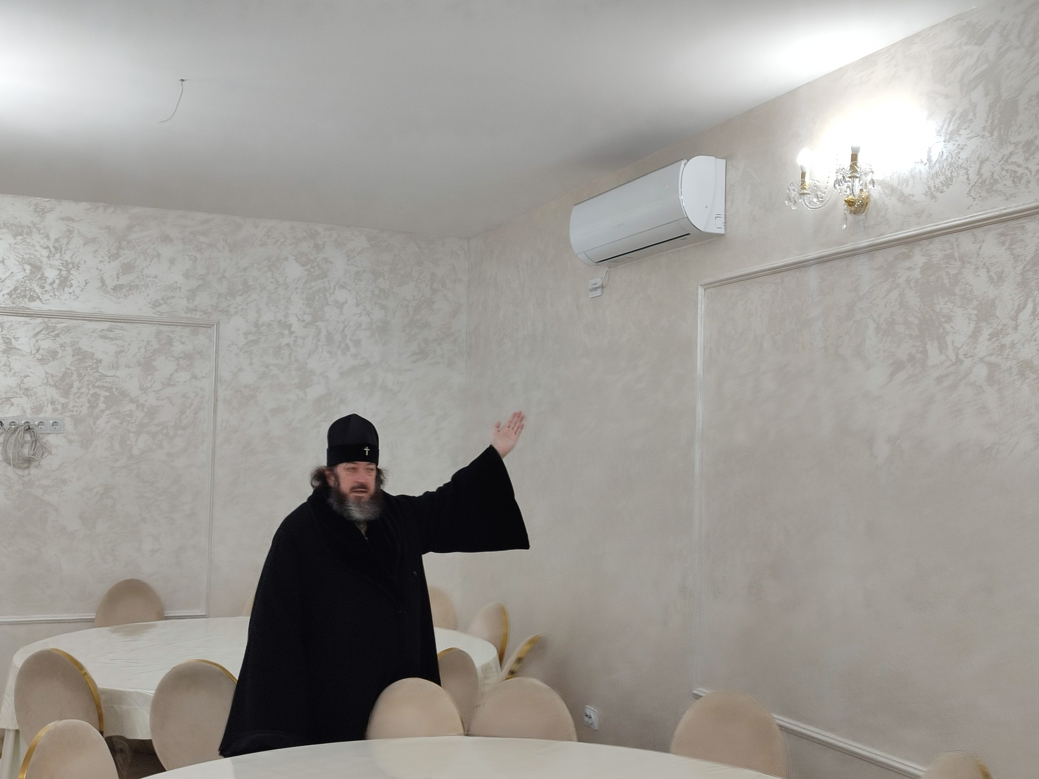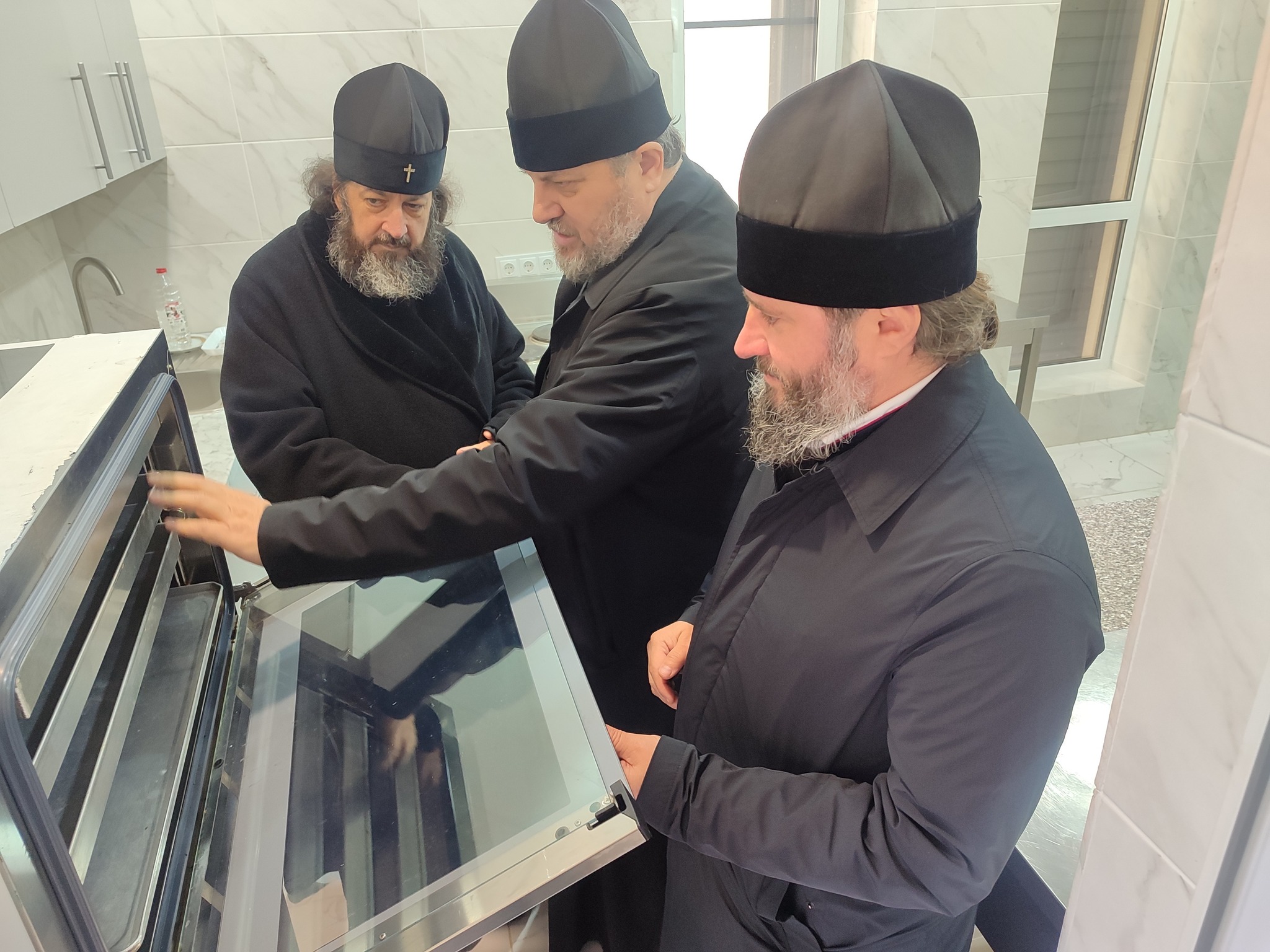Apoi, Înaltpreasfințitul Arhiepiscop PETRU însoțit de acești preacuvioși părinți, s-a deplasat la Catedrala Episcopală din mun. Ungheni, unde a prezentat incinta trapezei ,,Sf. Ierarh Ioan cel Milostiv”, arătând tot ce a fost făcută aici și obiectele (mesele, scaunele, condiționerele, lustrele, frigiderele, utilajul pentru facerea aluatului, dulapurile, aragazurile, mesele de inox, cuptoarele cu microunde, toată vesela care este în număr de peste o mie bucăți – farfurii, căni, pahare, cuțite, linguri, furculițe, veze) pe care Vladâca PETRU prin strădanie și cu multă cheltuială le-a procurat, amenajând corespunzător această frumoasă trapeză.