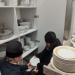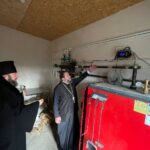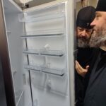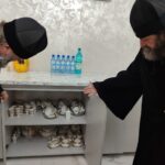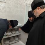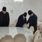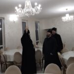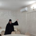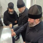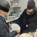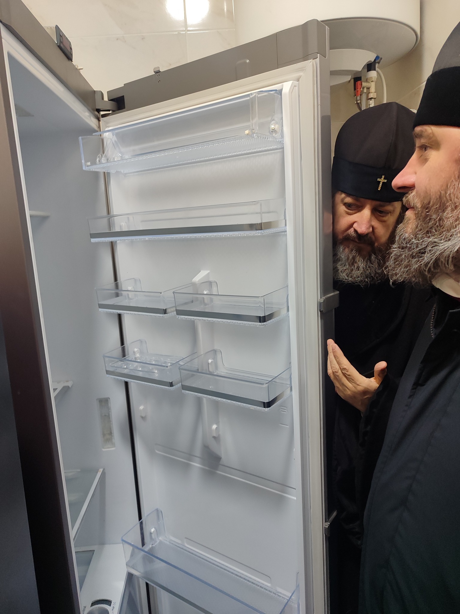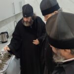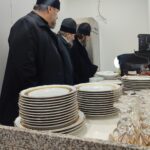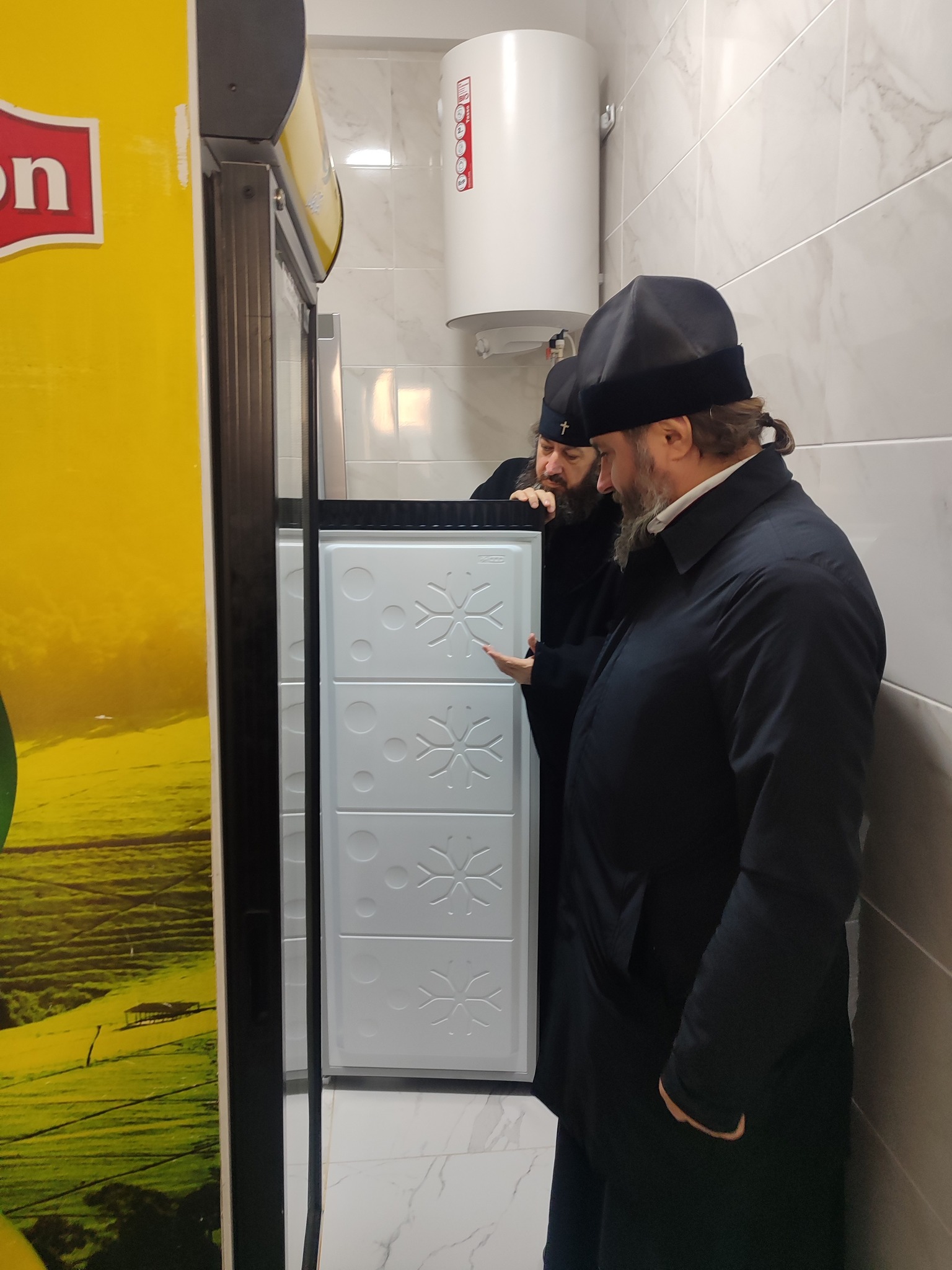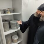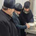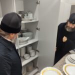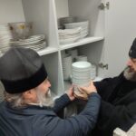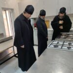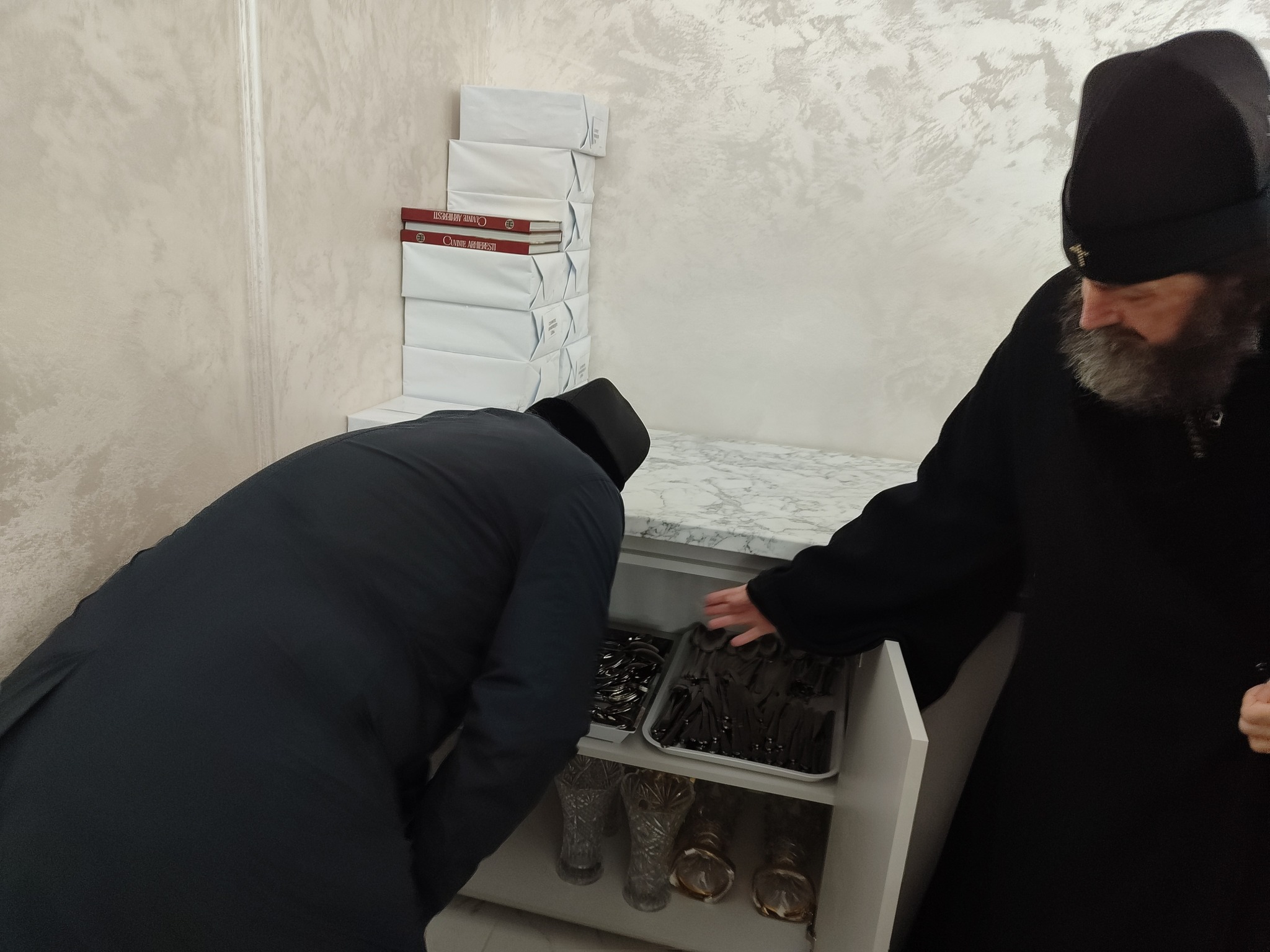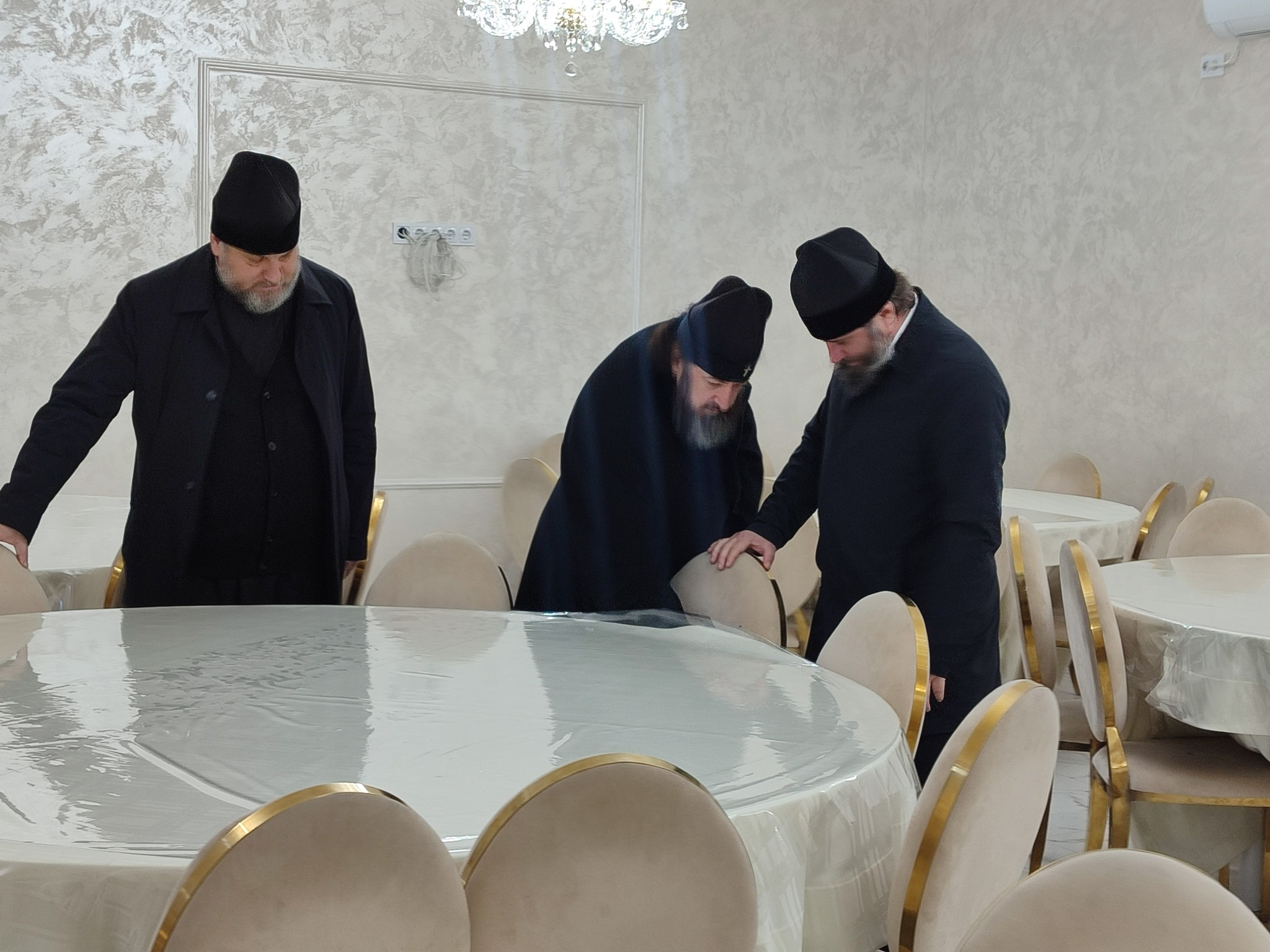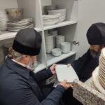 Apoi, Înaltpreasfințitul Arhiepiscop PETRU însoțit de acești preacuvioși părinți, s-a deplasat la Catedrala Episcopală din mun. Ungheni, unde a prezentat incinta trapezei ,,Sf. Ierarh Ioan cel Milostiv”, arătând tot ce a fost făcută aici și obiectele (mesele, scaunele, condiționerele, lustrele, frigiderele, utilajul pentru facerea aluatului, dulapurile, aragazurile, mesele de inox, cuptoarele cu microunde, toată vesela care este în număr de peste o mie bucăți – farfurii, căni, pahare, cuțite, linguri, furculițe, veze) pe care Vladâca PETRU prin strădanie și cu multă cheltuială le-a procurat, amenajând corespunzător această frumoasă trapeză.