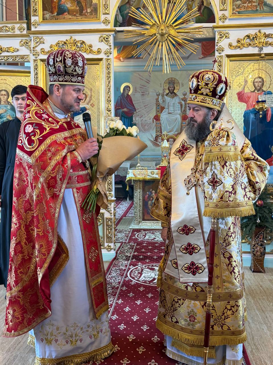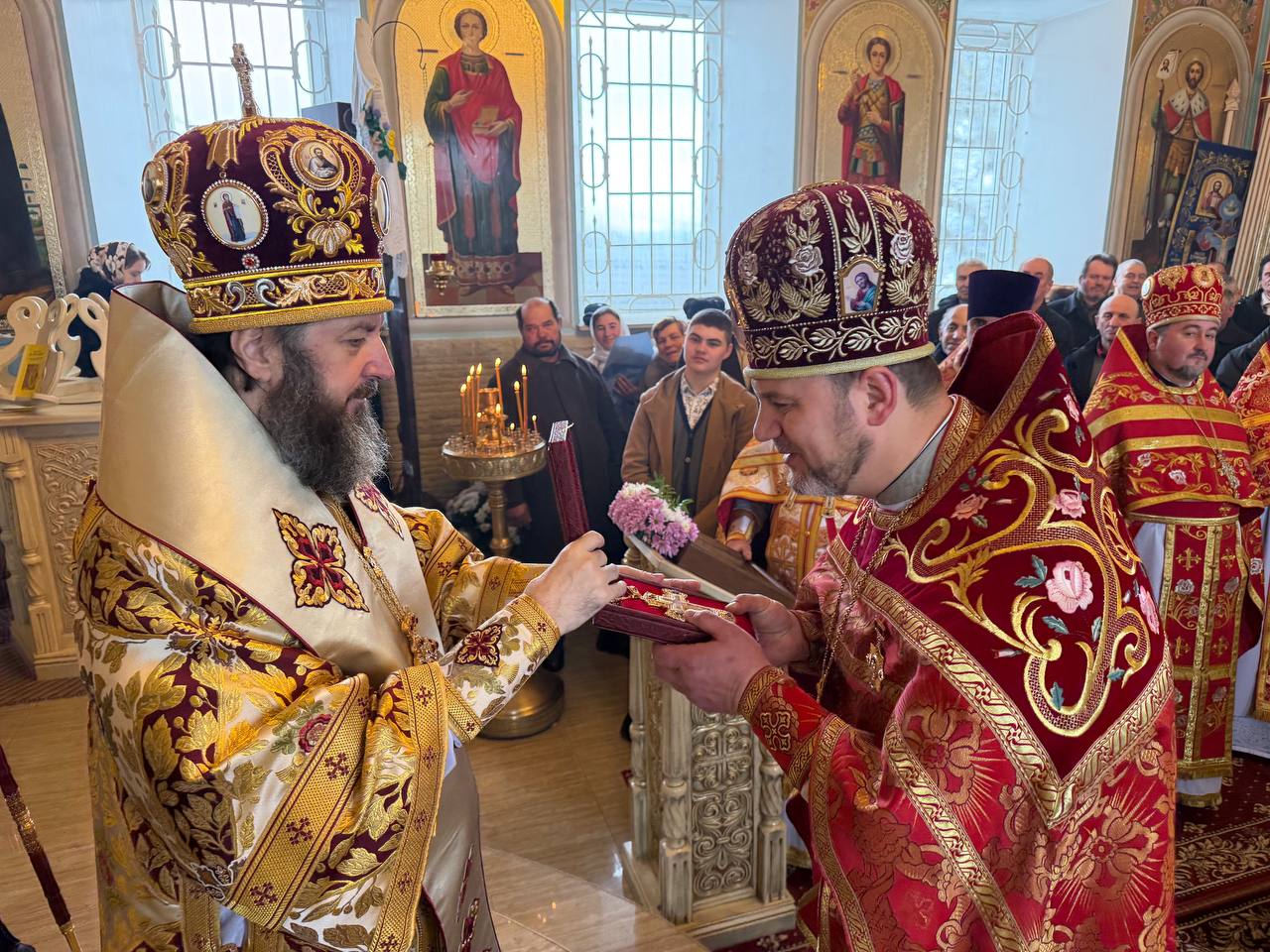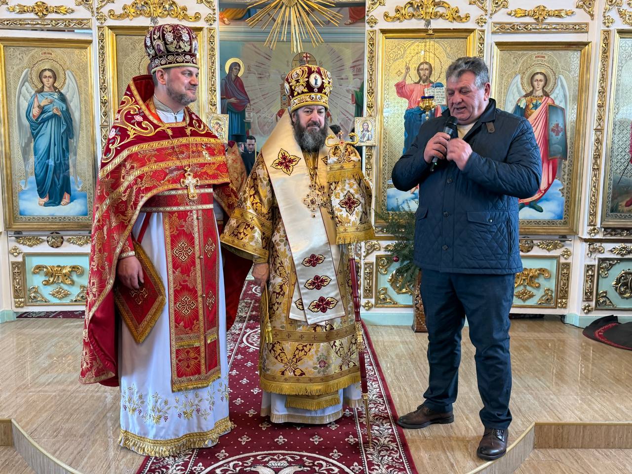 Apoi, Ierarhul la felicitat pe părintele parohul, Prot. Vitalie COZARI, adresându-i și înalte cuvinte de apreciere pentru toată munca și faptele rodnicii slujirii preoțești înfăptuite în cuprinsul parohiei, dar și-n afara ei, în cuprinsul Protopopiatului și a Eparhiei, dar și-n alte locuri unde a fost binecuvântat să slujească ți să se îngrijească duhovnicește de creștinii adunați.