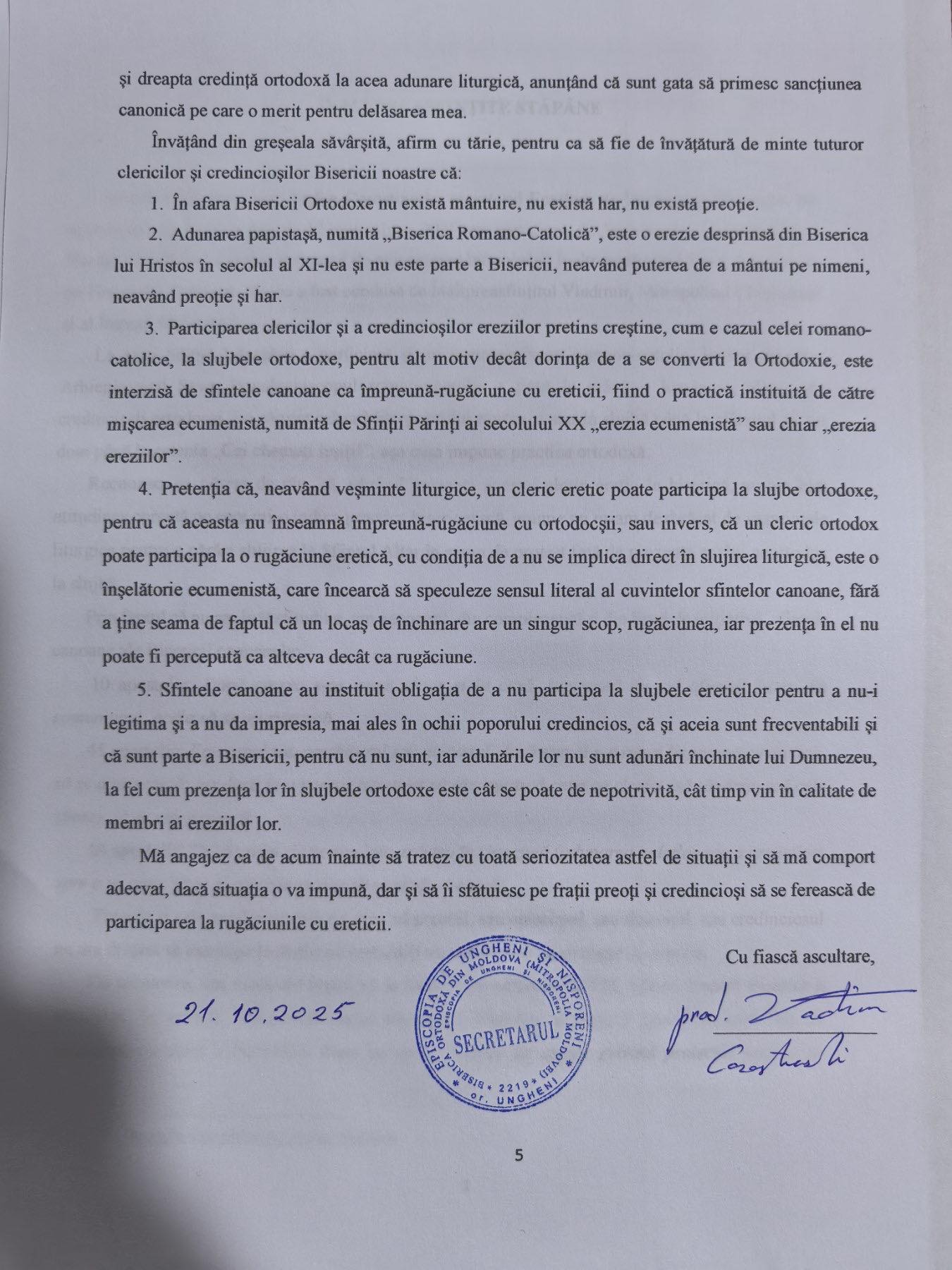 Mă angajez ca de acum înainte să tratez cu toată seriozitatea astfel de situații și să mă comport adecvat, dacă situația o va impună, dar și să îi sfătuiesc pe frații preoți și credincioși să se ferească de participarea la rugăciunile cu ereticii.
