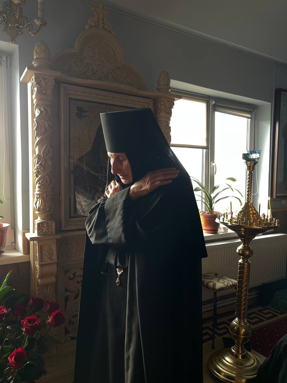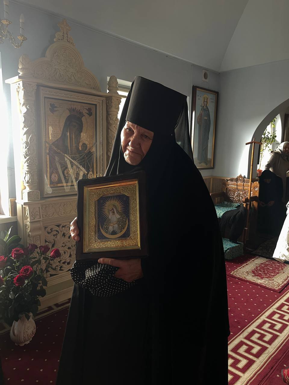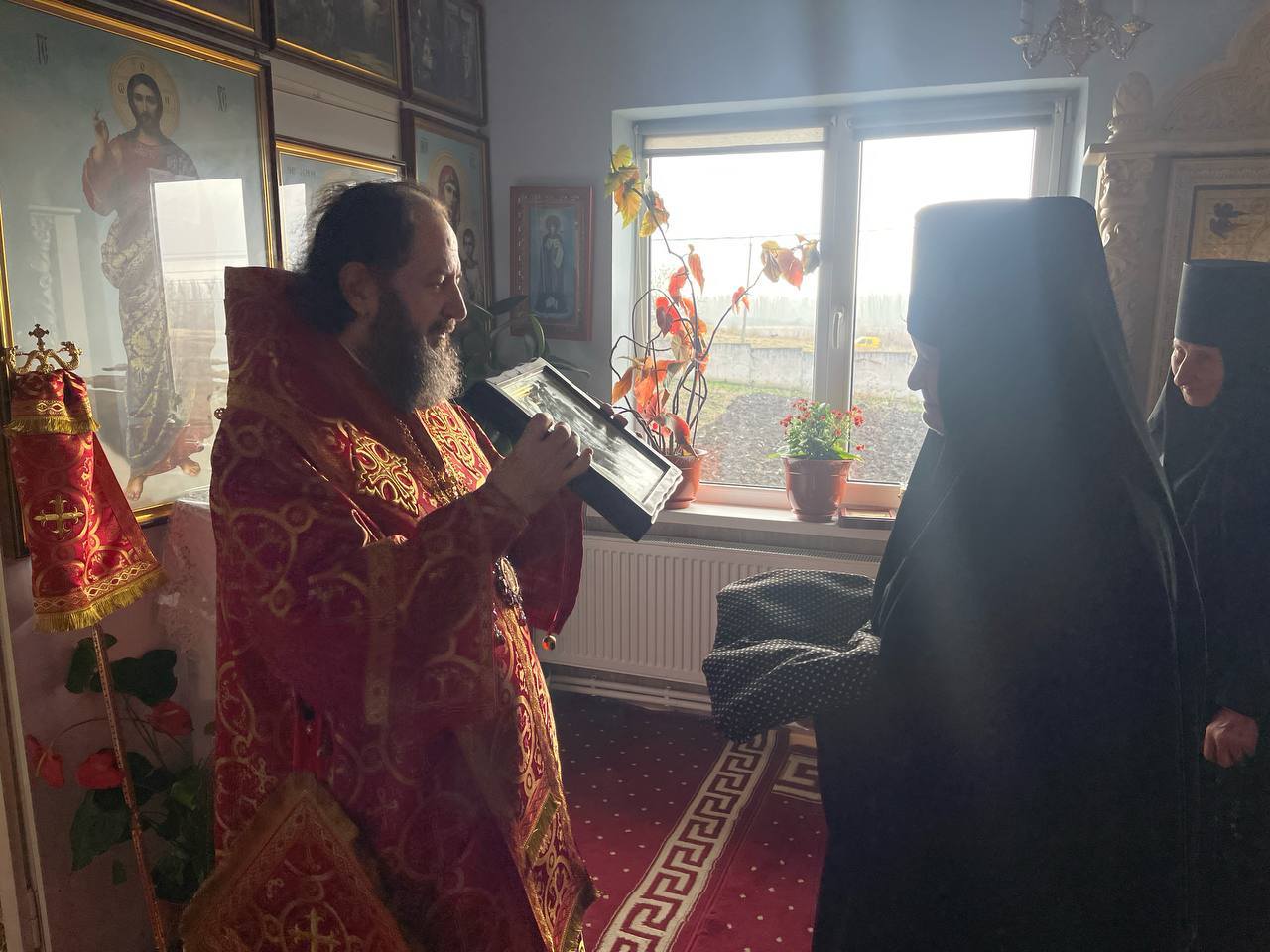 Apoi, Înaltpreasfinția Sa, a felicitat obștea monahală și credincioșii prezenți și pe toți cei omagiați, oferind în dar o sfântă icoană, omagiatei monahiei Varvara, viețuitoare a mănăstirii.