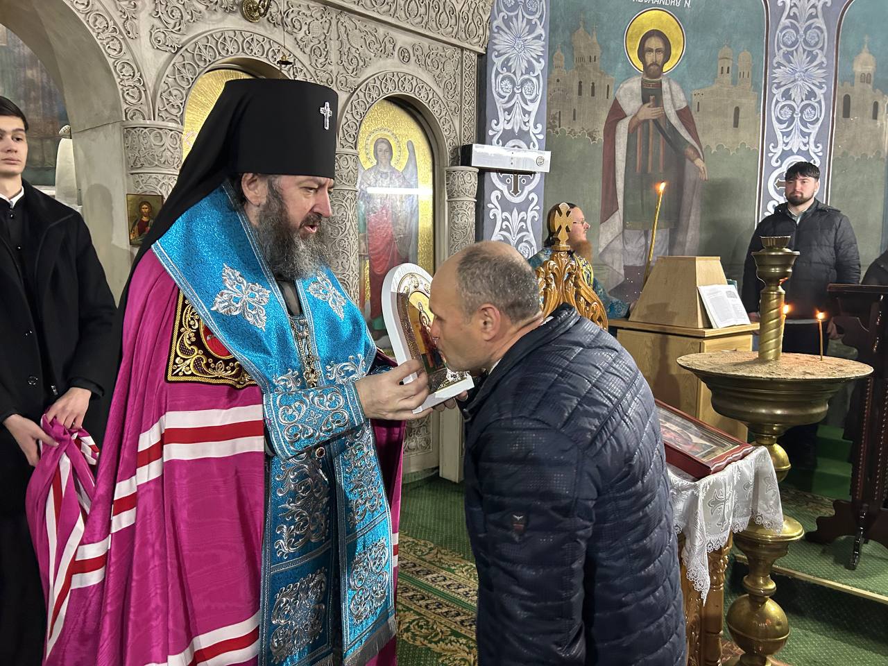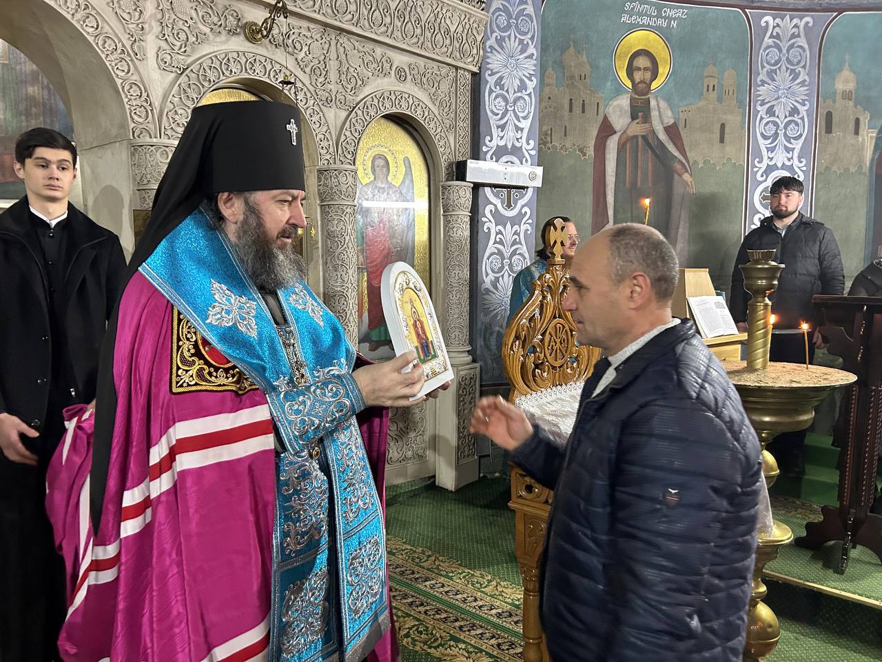 Apoi, Ierarhul a oferit în dar o frumoasă icoană argintată unui enoriaș activ al Catedralei Episcopale, care a împlinit astăzi 60 ani de viață, adresându-i cuvinte de felicitare și urări de bine.