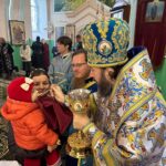 După rugăciunea Tatăl nostru…, Înaltpreasfinția Sa a împărtășit copiii și credincioșii ce s-au pregătit pentru primirea Sfintei Împărtășanii.