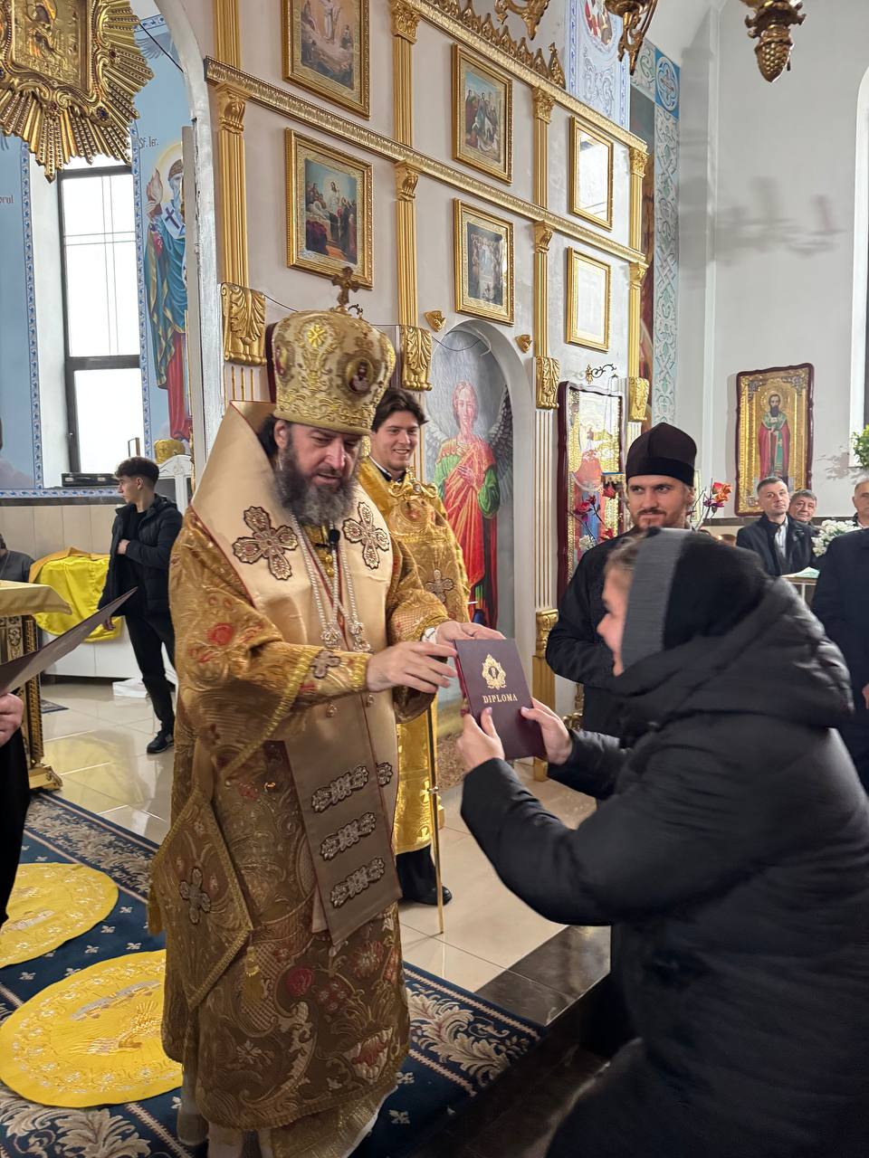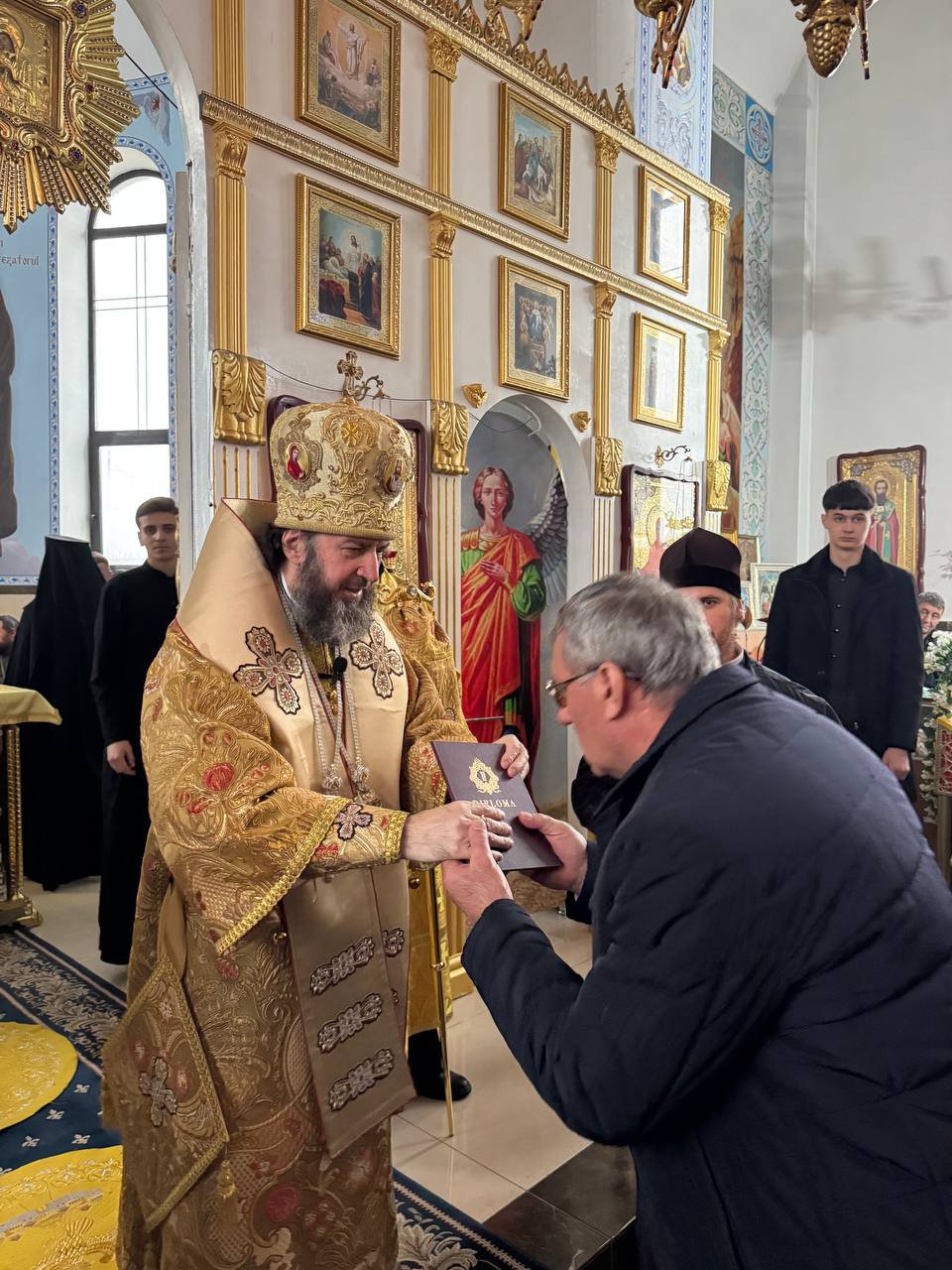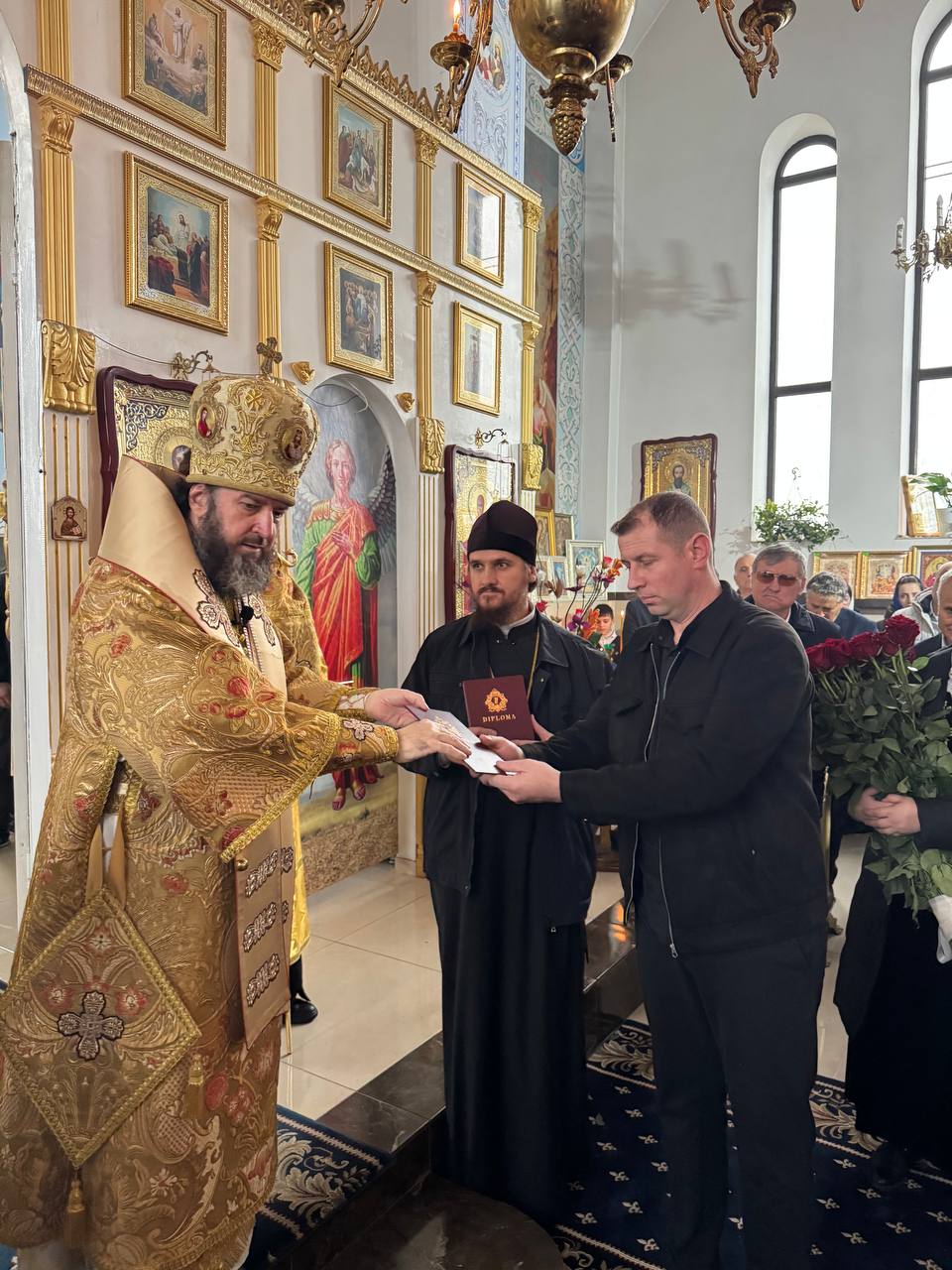 După aceasta Înaltpreasfinția Sa l-a decorat pe ctitorul principal al bisericii, dnl Iurie VRABIE, cu medalia mitropolitană, ,,Sf. Ierarh Dionisie Erhan”, în semn de apreciere și recunoștință pentru toată jertfa și contribuția considerabilă din partea domnie sale oferită cu generozitate la edificarea Sfintei Biserici și a trapezei din curtea bisericii. Apoi Chiriarhul a înmânat Medalii Eparhiale și Diplome Arhierești unor ctitori și binefăcători ai acestei biserici.