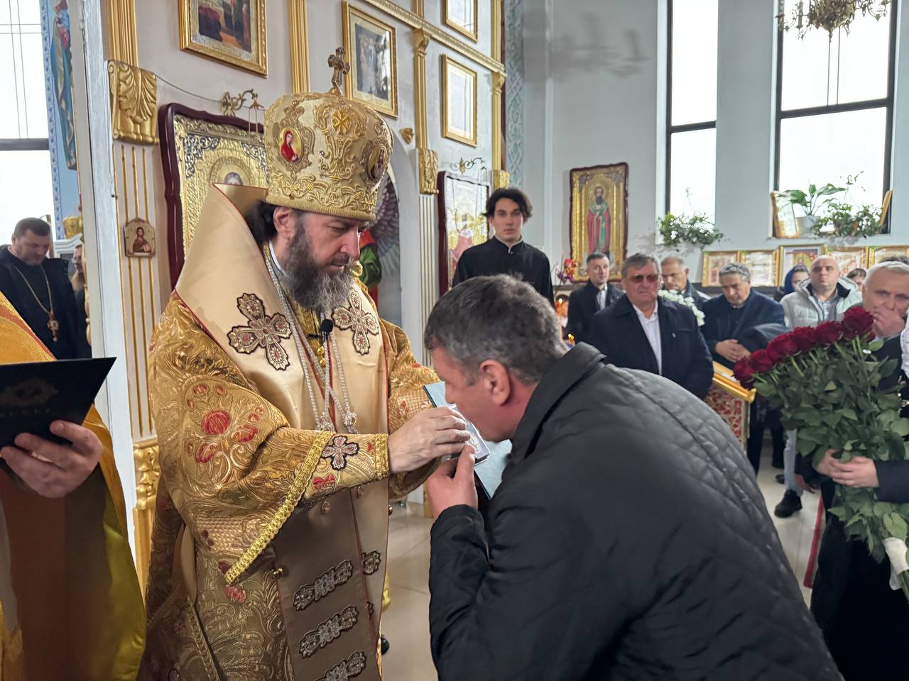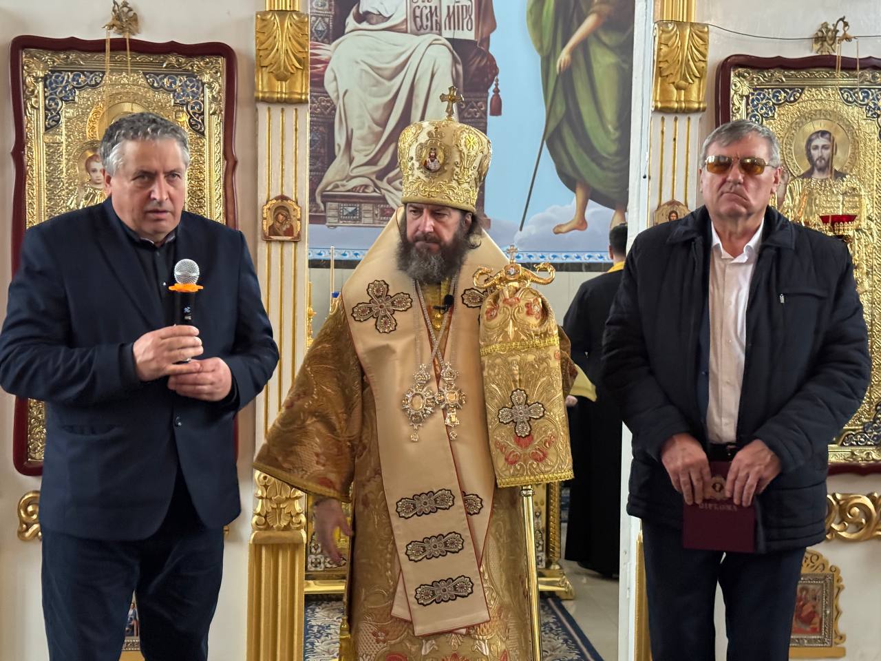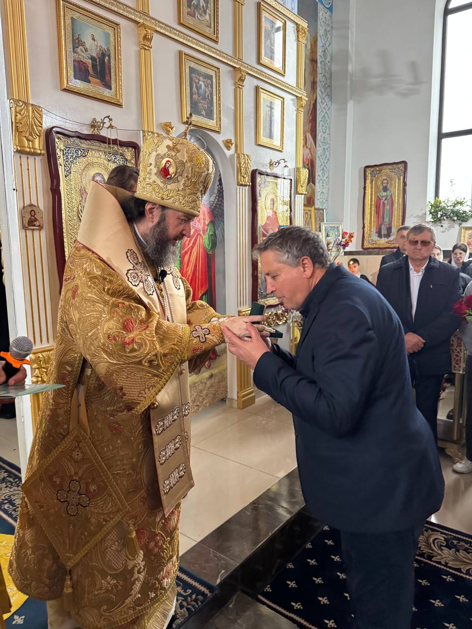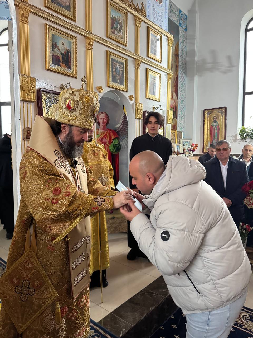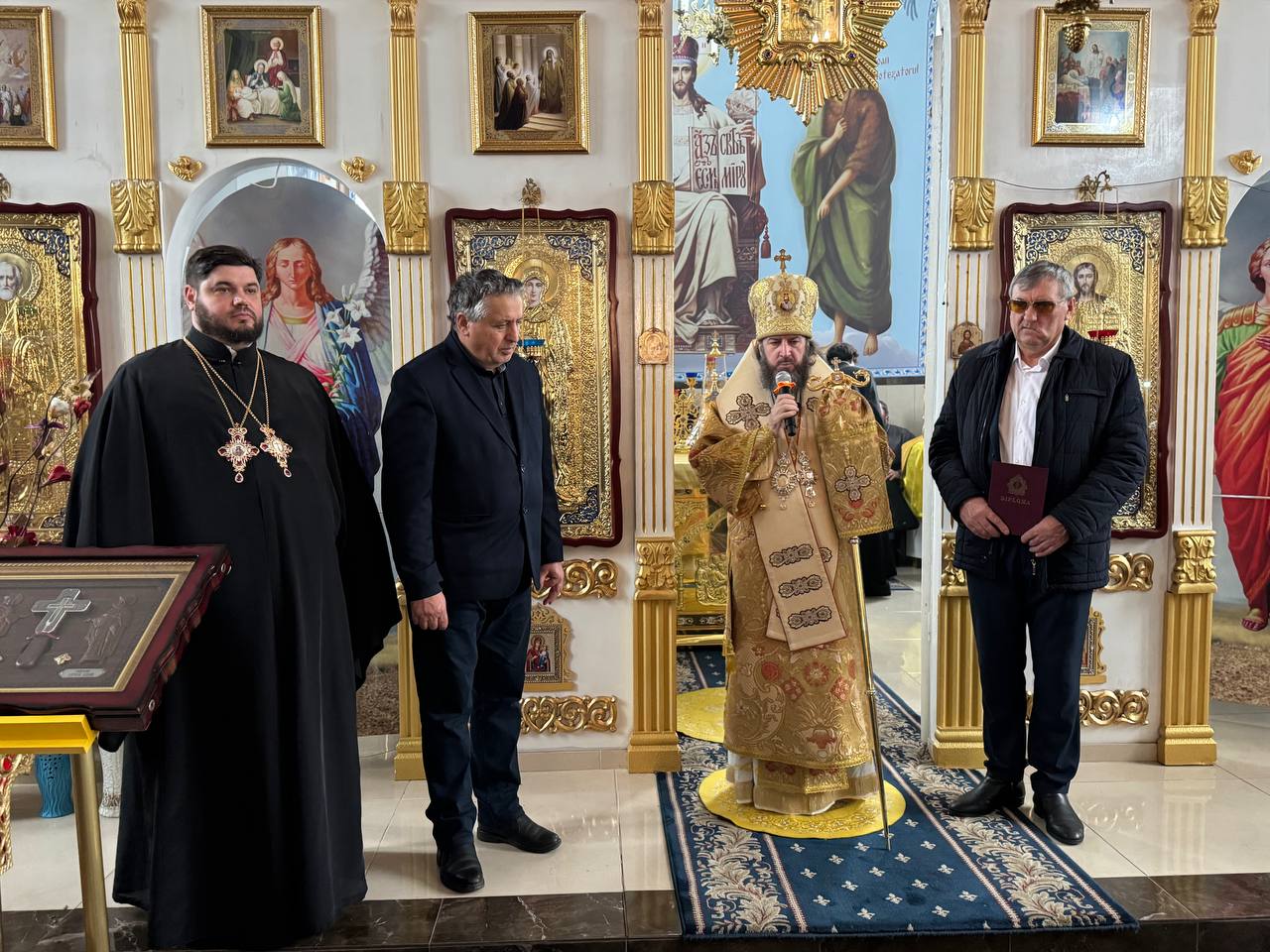 Apoi, Ierarhul a adresat un cuvânt de felicitare părintelui paroh, prot. Vadim COROSTINCHI, oferindu-i în dar două cruci pectorale foarte frumoase.