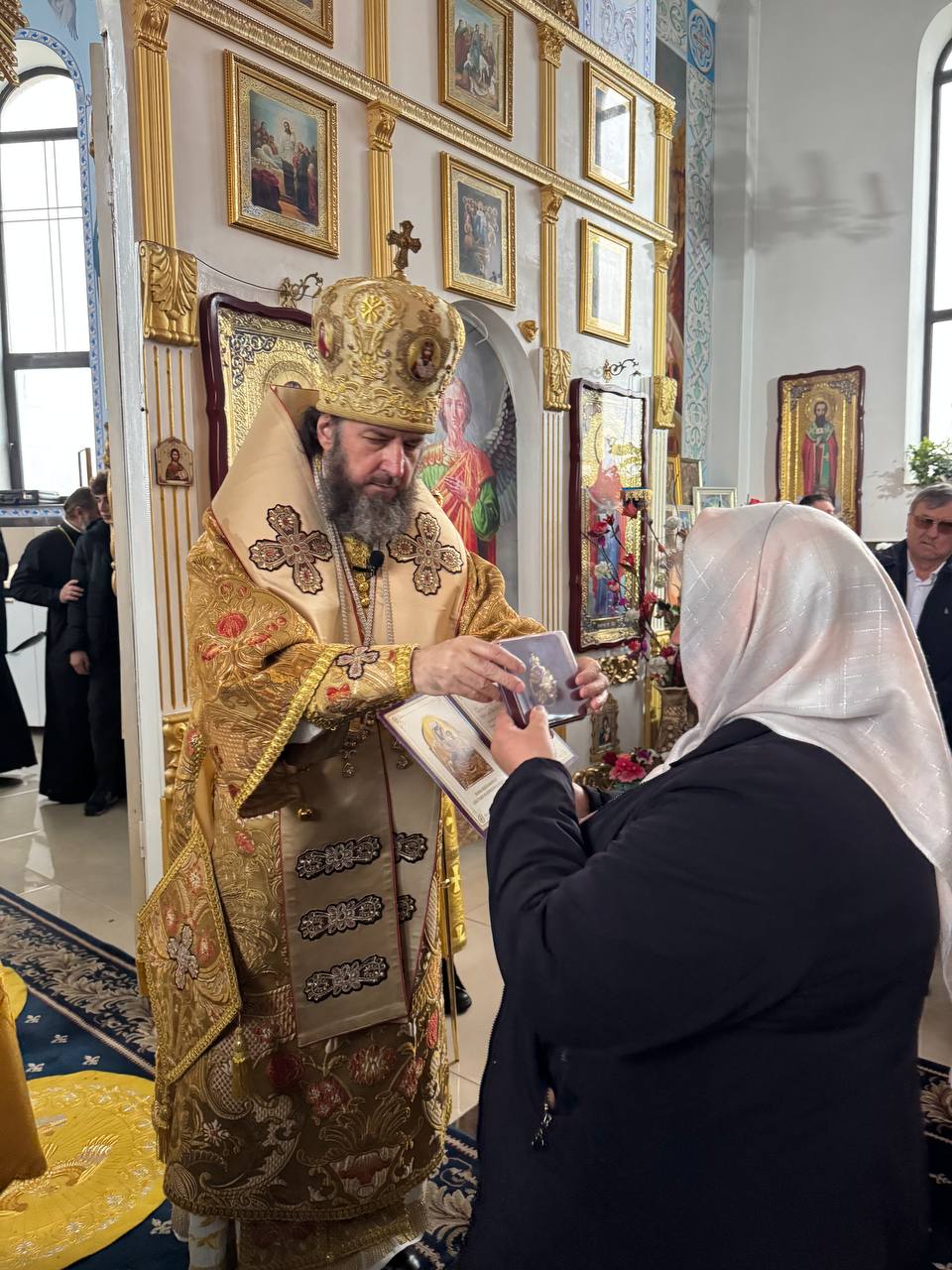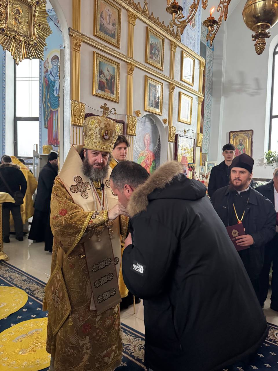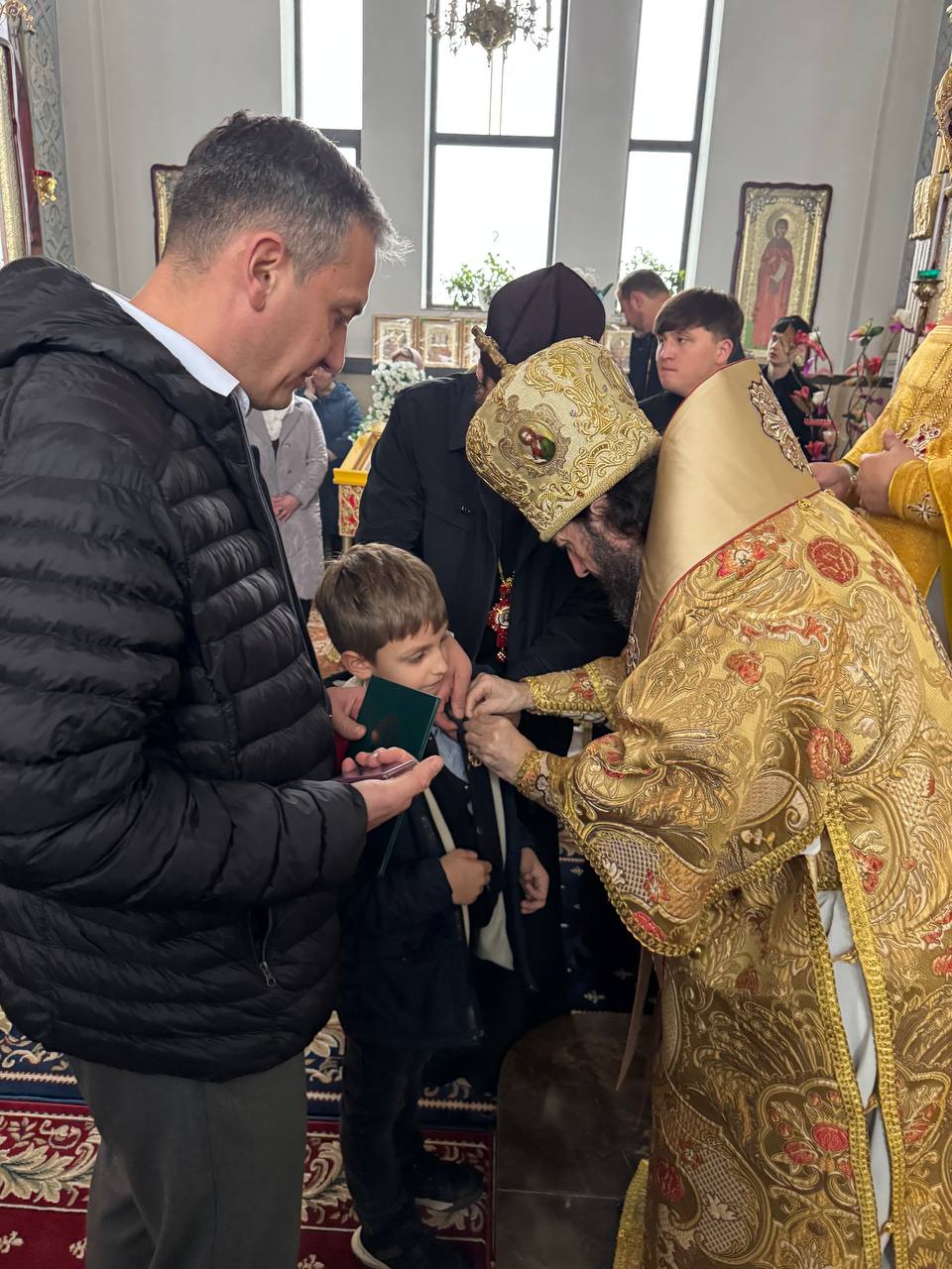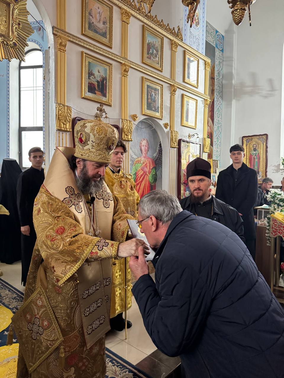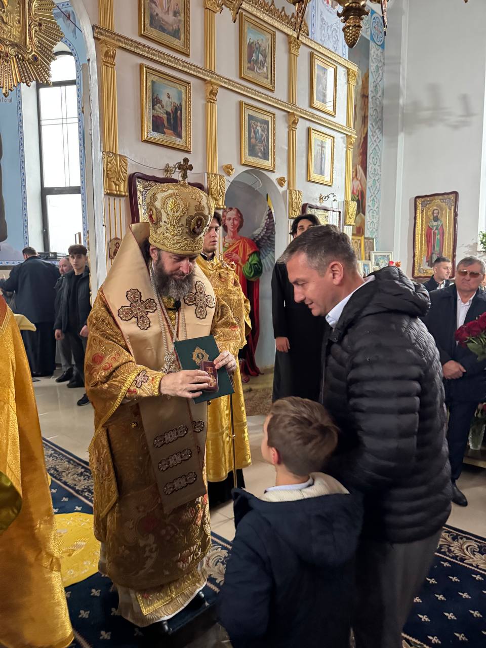 Apoi, Ierarhul a adresat un cuvânt de felicitare părintelui paroh, prot. Vadim COROSTINCHI, oferindu-i în dar două cruci pectorale foarte frumoase.
