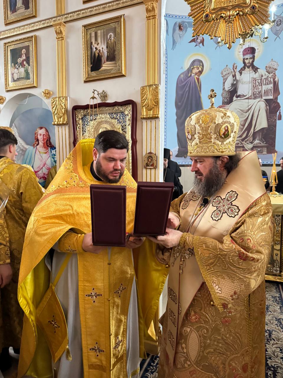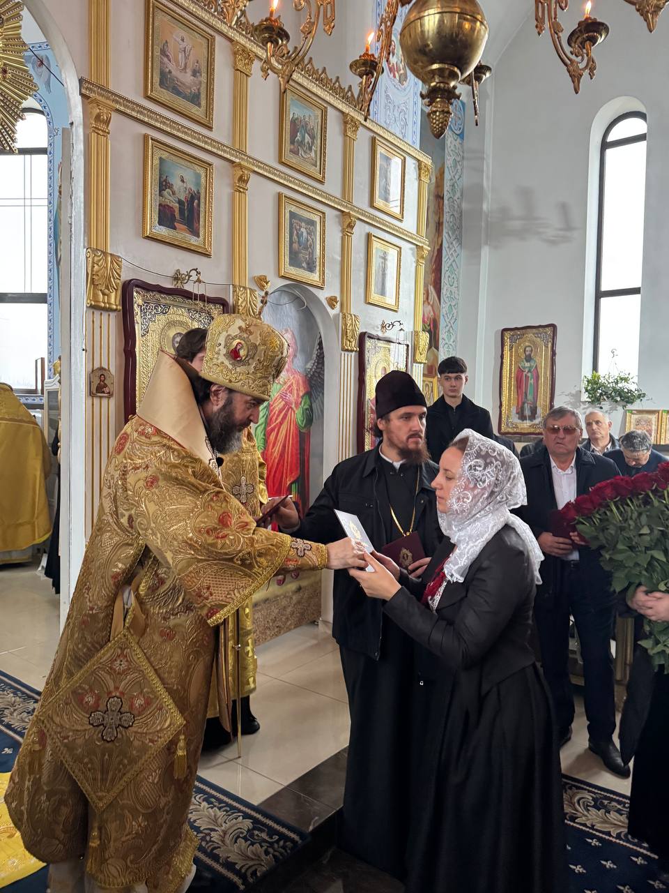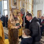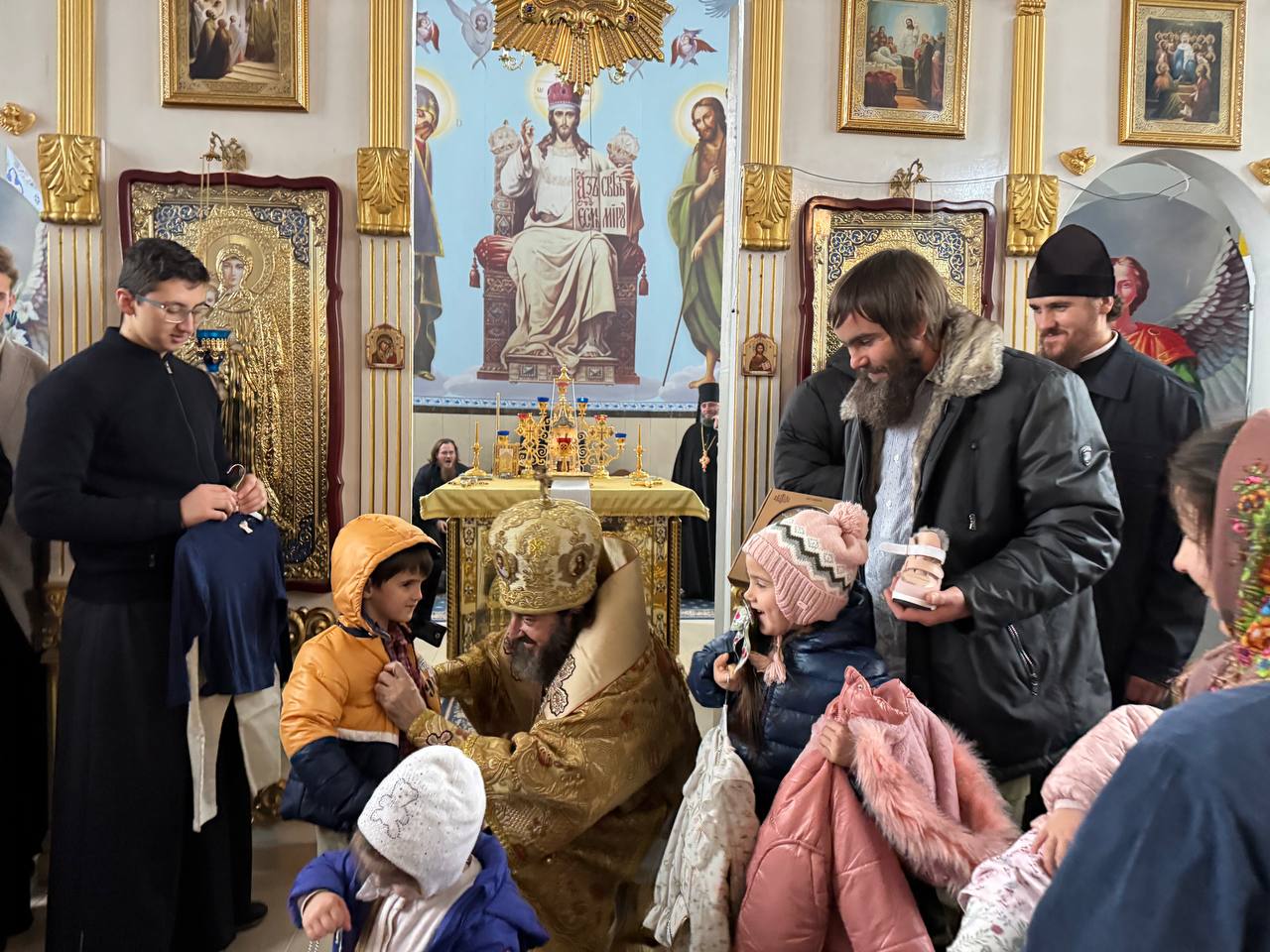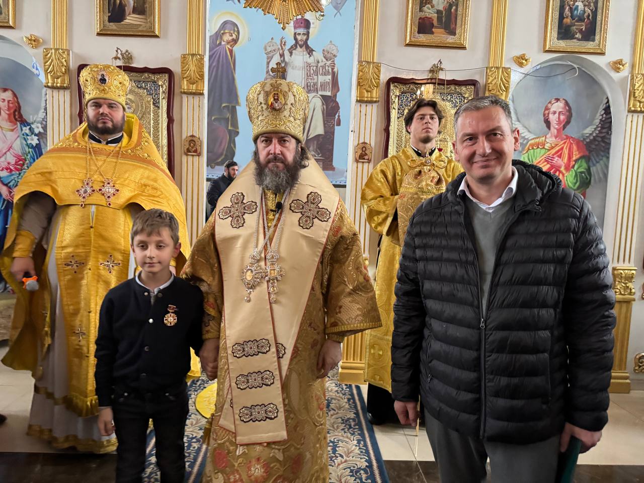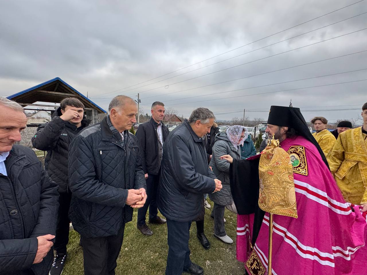 Apoi, Ierarhul a adresat un cuvânt de felicitare părintelui paroh, prot. Vadim COROSTINCHI, oferindu-i în dar două cruci pectorale foarte frumoase.