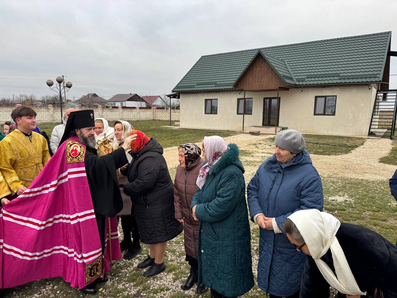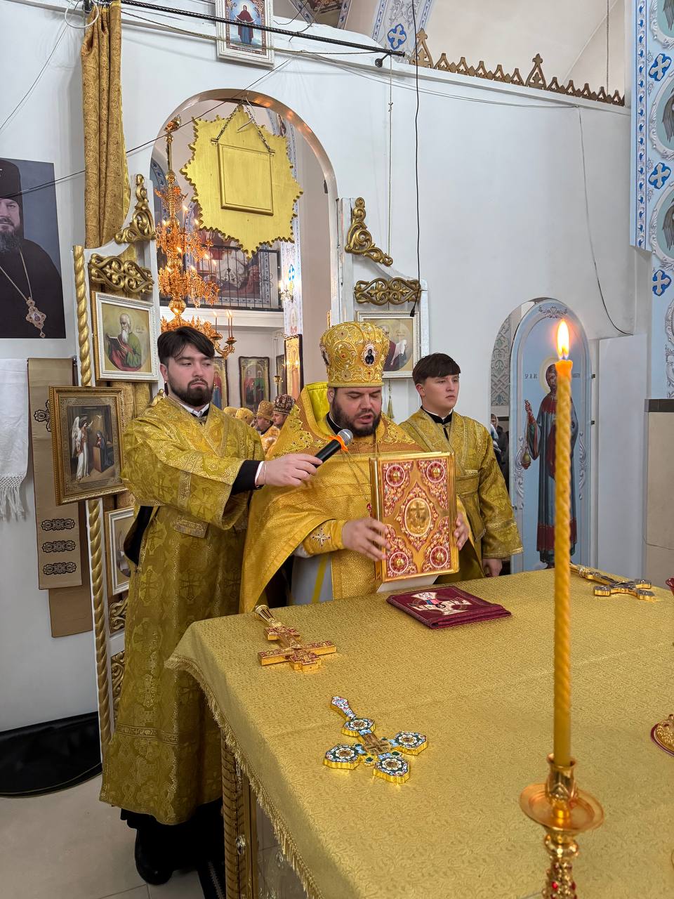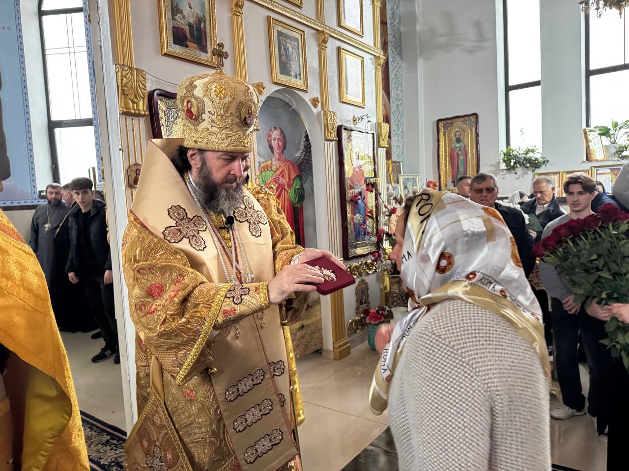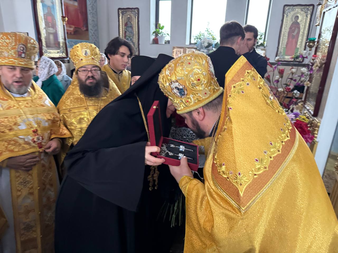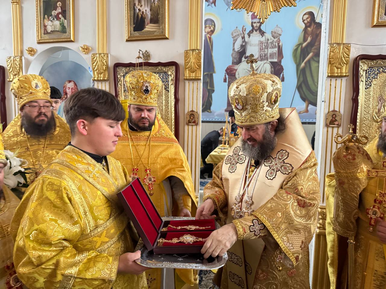 Apoi, Ierarhul a adresat un cuvânt de felicitare părintelui paroh, prot. Vadim COROSTINCHI, oferindu-i în dar două cruci pectorale foarte frumoase.
