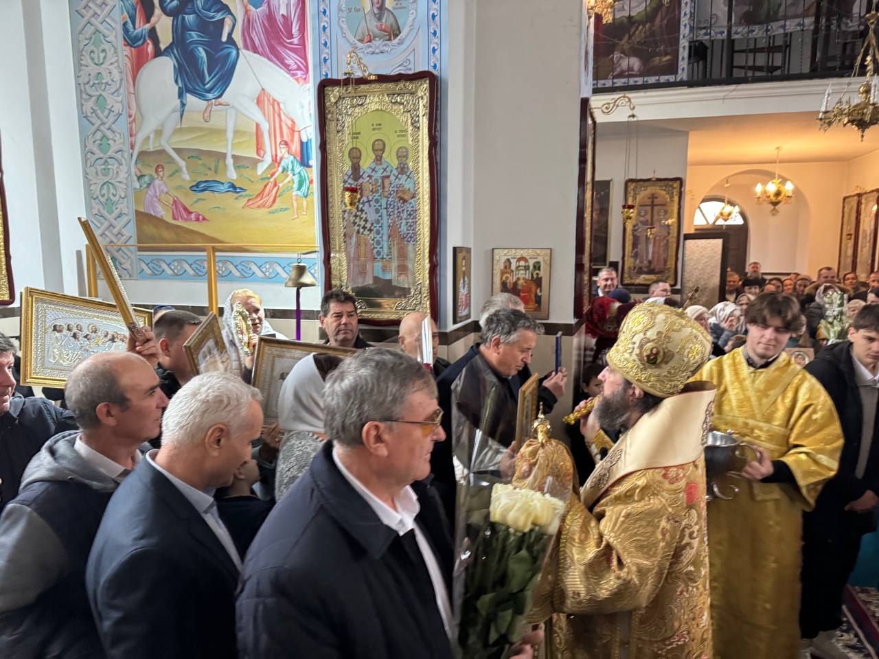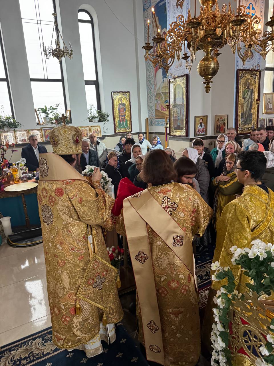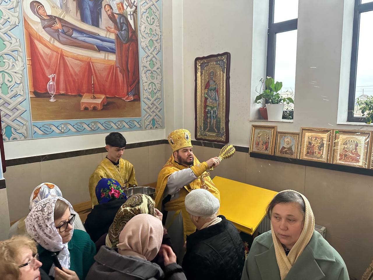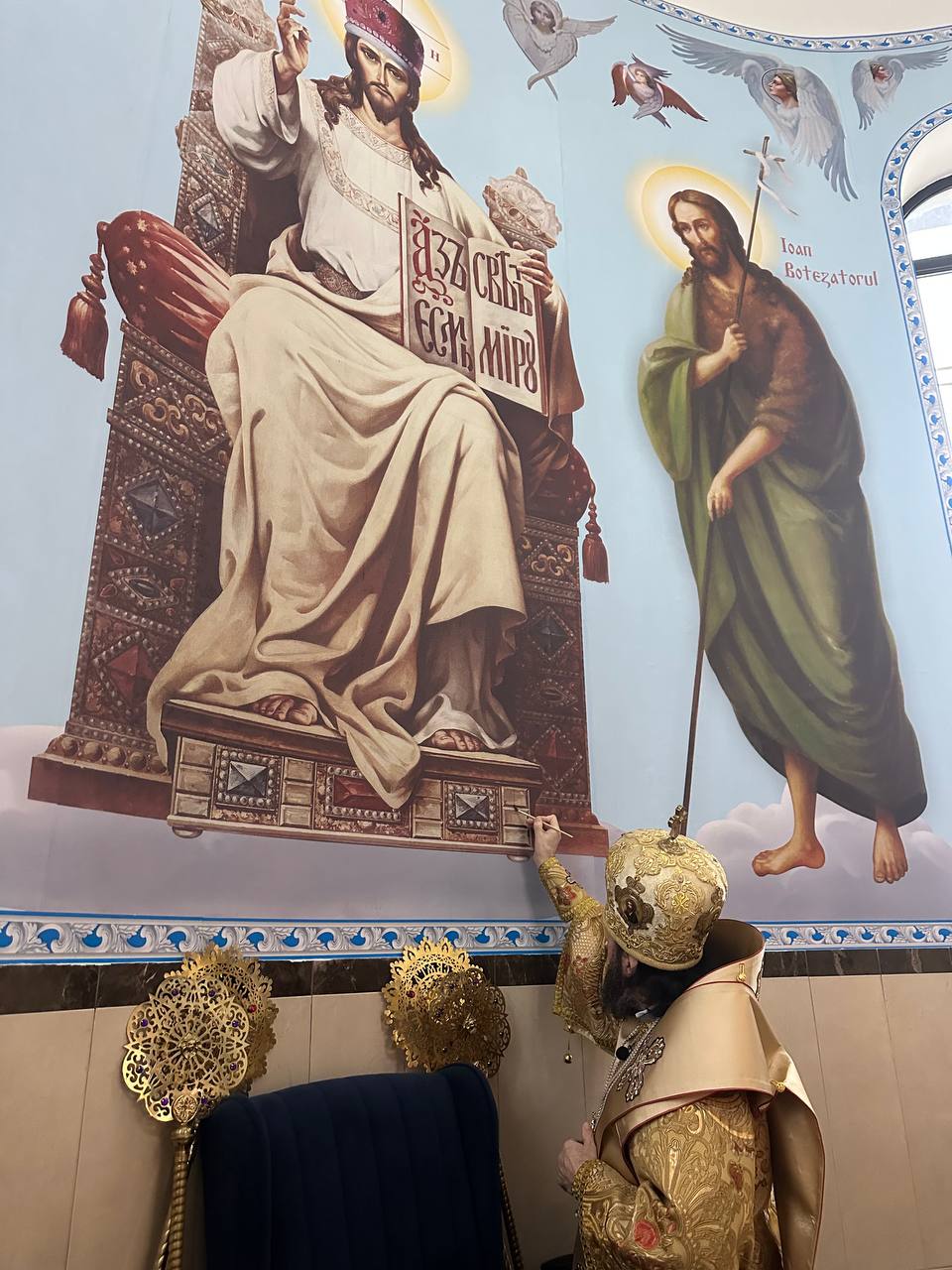 Înainte de începerea Sfintei Liturghii, Înaltpreasfințitul Arhiepiscop PETRU a citit rugăciunea de sfințire a bisericii, după care Sfântul Locaș a fost uns cu Sfântul și Marele Mir și a fost stropită cu sfânta Agheasmă.